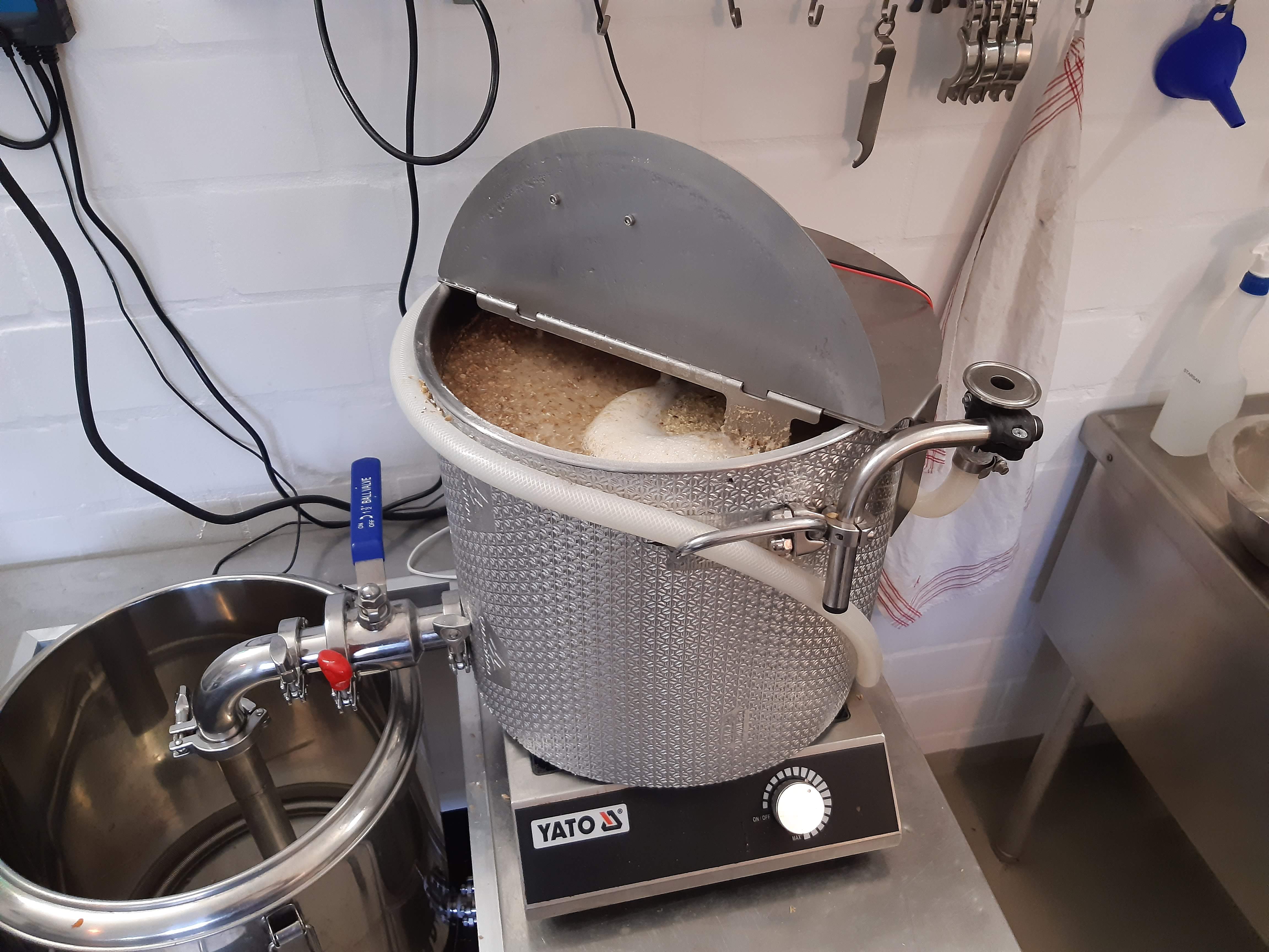 Wasser mittels Wasserschlauch in die Pfanne und nach Erreichen der Einmaischtemperatur fix eingemaischt.