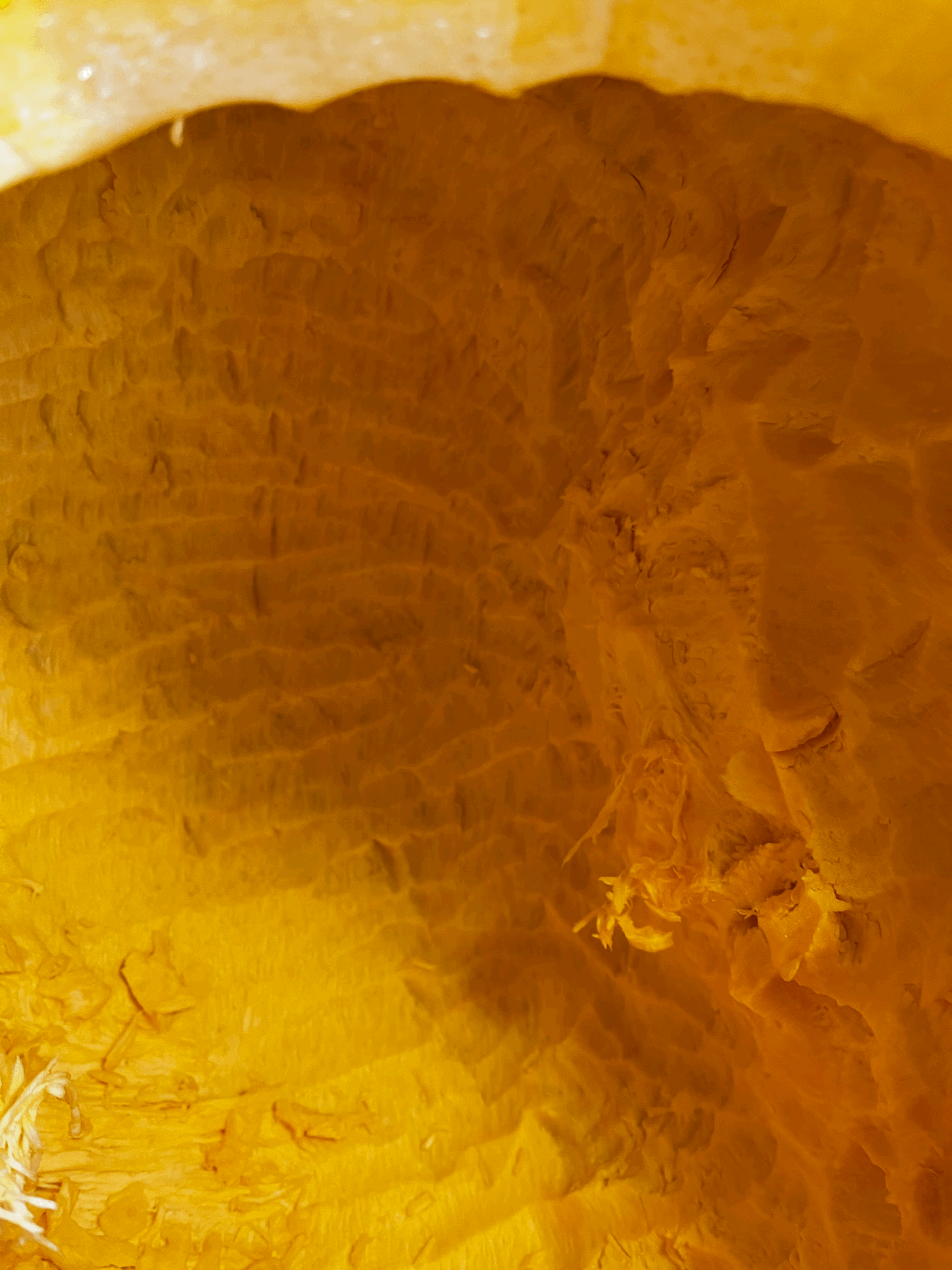 Das Aushöhlen mit dem angeschärften Eislöffel lief richtig gut und ich hatte schöne große Kürbisfleischlocken. Fast hätte ich zu viel ausgeschabt, an einigen Stellen scheint schon das Licht durch. Der Kürbis ist aber gut ausgereift und die Schale schön hart, bis jetzt hält es. Den Rand um den Deckel habe ich wieder etwa 3cm stark gelassen und wieder zwei Spanngurte rumgeschlagen.