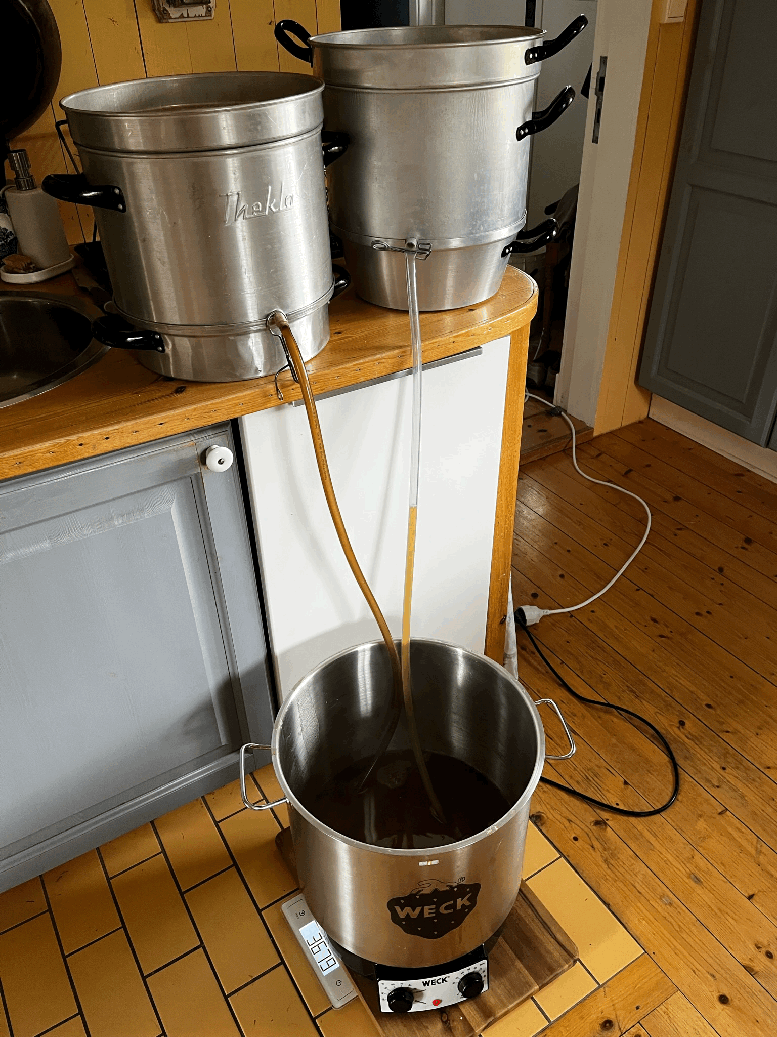 Ich weiß nicht genau, wieviel Liter es diesmal sind, auf jeden Fall unter 20 Liter, aber mit 15,2 Plato hoffentlich ein schönes Bier für den Winter.