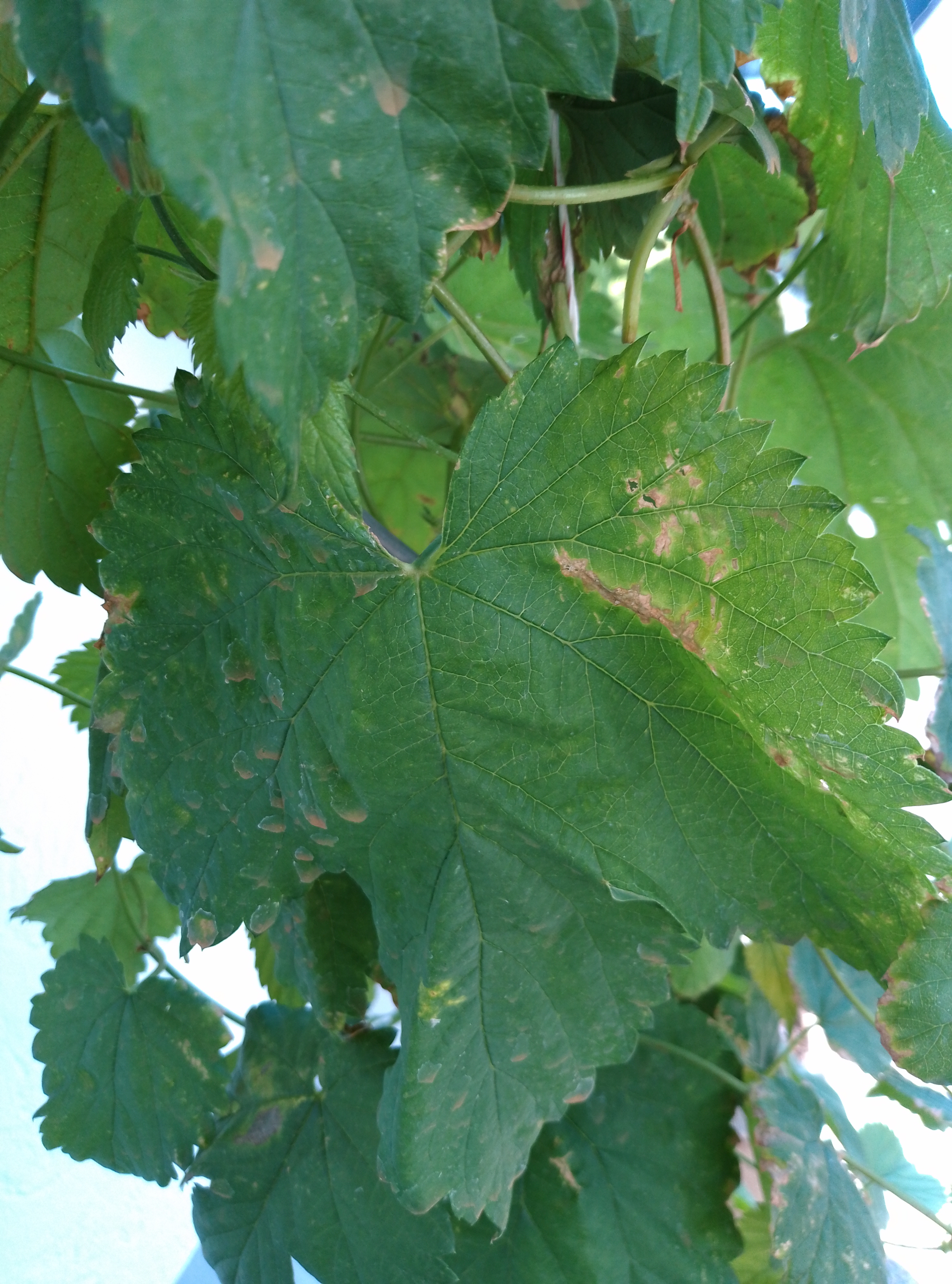 So sieht mein Hopfen seit ein paar Tagen aus. Einjährige Pflanzen in Kübeln an der Hauswand, 3 verschiedene Sorten, tritt bei allen auf. Weiß jemand was das sein könnte?