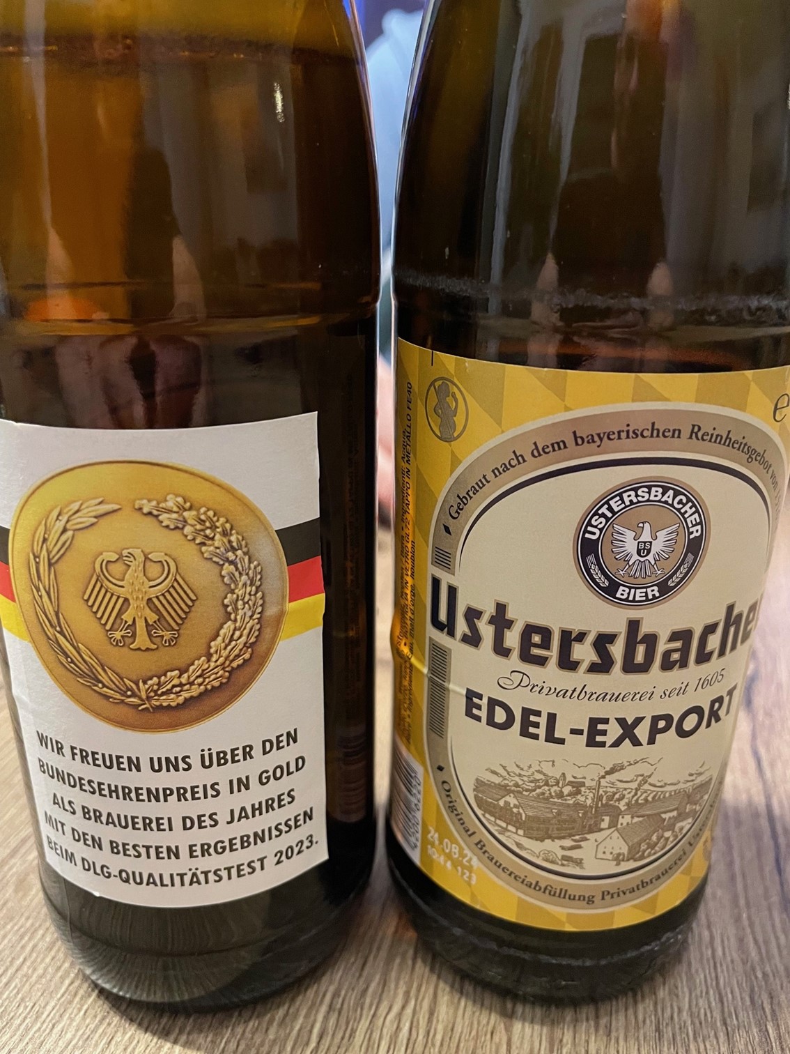 Ein Ustersbacher Edel-Export. Sehr fein, goldgelbe Farbe, glanzfein, feste, feinporige Schaumkrone, schön anhaftende Schaumringe. Sehr gut.