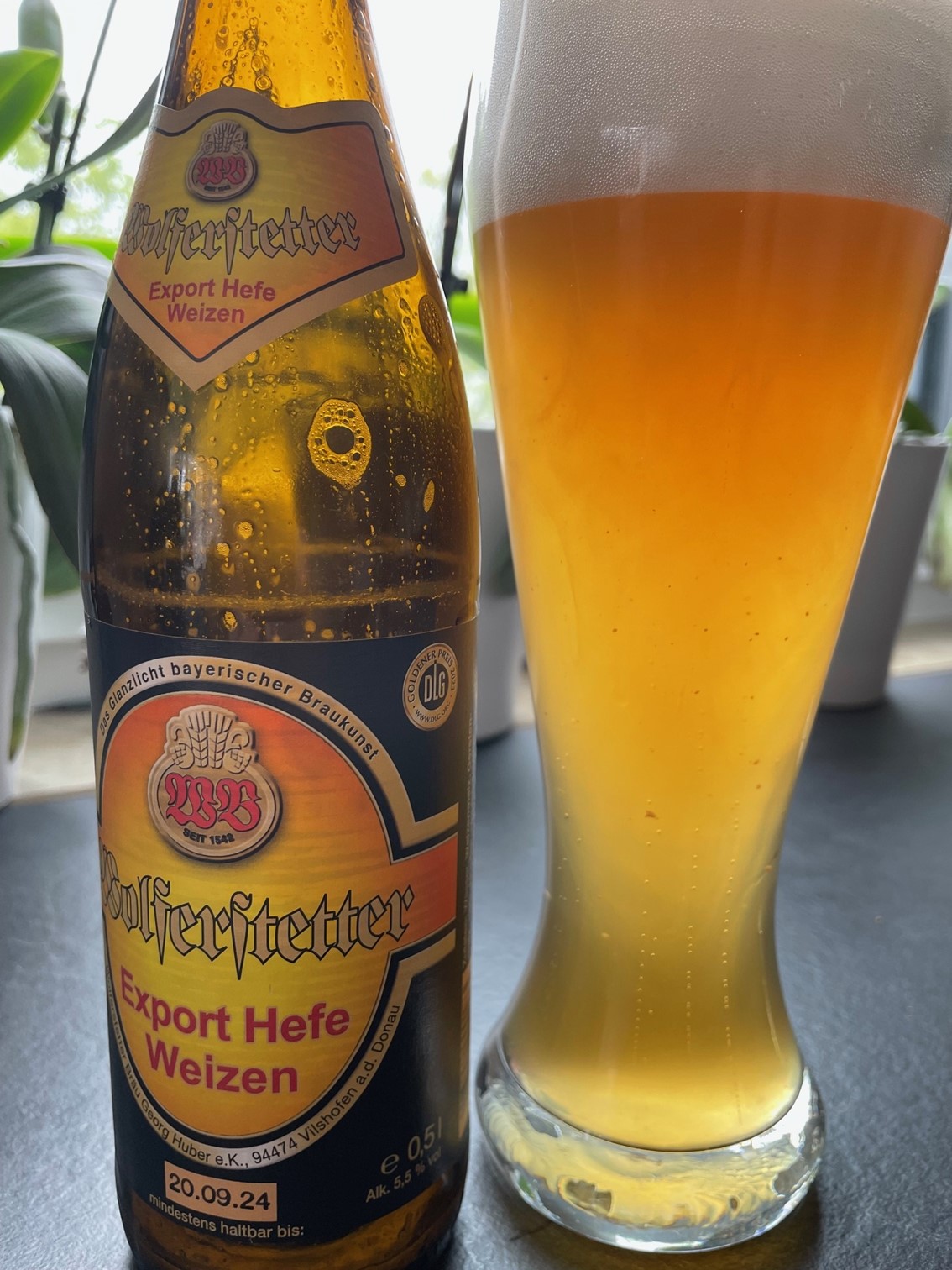 Ein Wolferstetter Export Hefeweizen. Gem. Auskunft von deren Homepage eine Flaschengärung. Der Schaum ist superfein, sehr kompakt und hält gut, farblich goldgelbes Bernstein, hier mit Reflexen von der aufgeschüttelten Hefe (ist mir nicht vollständig geglückt). Das Mundgefühlt ist überragend weich und rund, definitiv Frucht, Banane ehr nicht, ehr was exotisches. Toll gemacht!! :thumbup