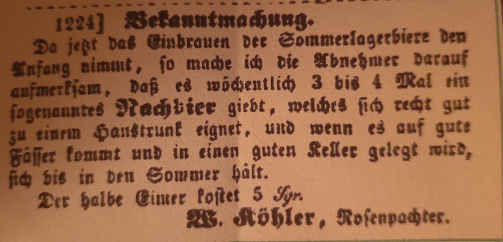 Ich übersetze mal kurz: "Wer will mein Glattwasser?"Bekanntmachung. Da jetzt das Einbrauen der Sommerlagerbiere den Anfang nimmt, so mache ich die Abnehmer darauf aufmerksam, daß es wöchentlich 3 bis 4 mal ein sogenanntes Nachbier giebt, welches sich ganz gut zu einem Haustrunk eignet, und wenn es auf gute Fässer kommt, und in einen guten Keller gelegt wird, sich bis in den Sommer hält.