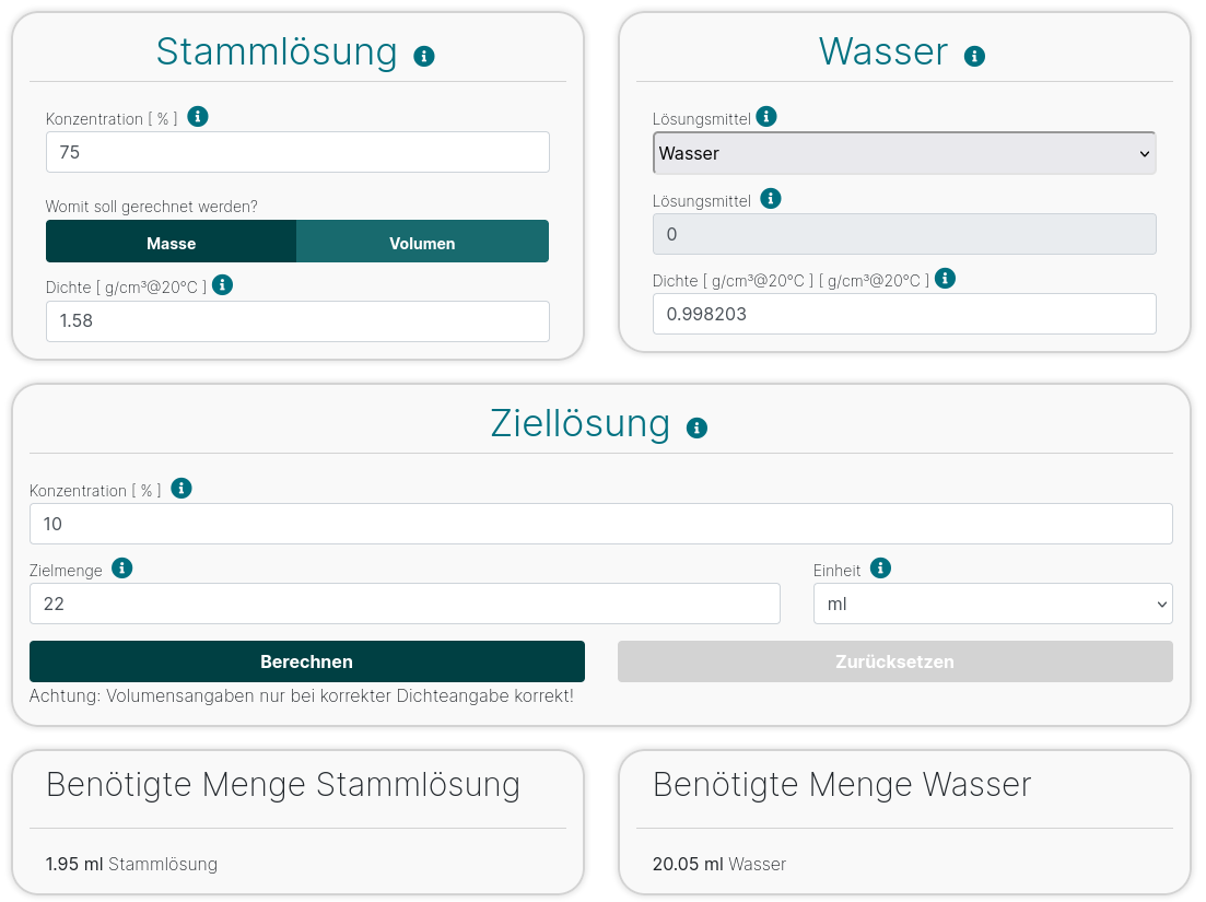 Das alte Sheet hatte nur mit 10 % gerechnet. Ich habe dann einfach die gewählte Konzetration mit der Masse der reinen Säure auf 10 % gerechnet. Damit musste deutlich weniger umgestrickt werden. Und es ist leichter nach zu verfolgen wenn was nicht stimmt.