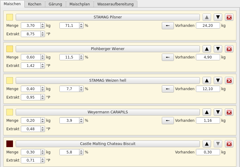 Wenn ich beim nächsten Brautag anfange meinen pH-Wert zu messen, möchte ich ich vorbereitet sein und darauf dann Rücksicht nehmen. Ich habe entsprechend die pH-Werte aus den Datenblättern der Malze oder aus dem Spreadsheet vom Experiment von MMuM im KBH2 eingetragen. Soweit schaut das gut aus.