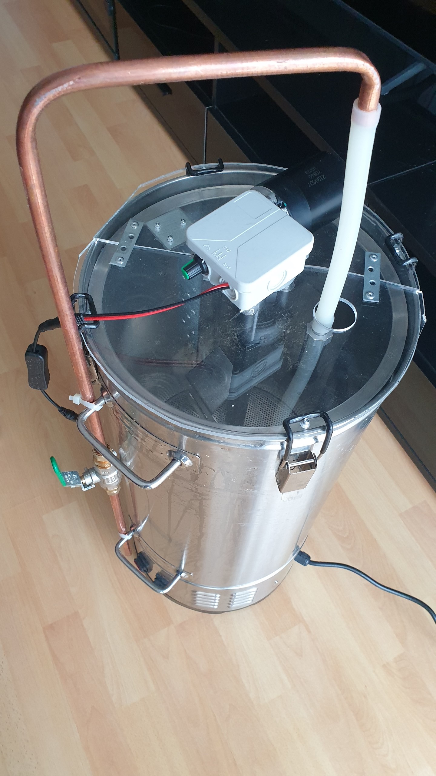 Meine Anlage wird auch immer besser. Ich habe mich für einen 35 l Maischekessel von Digiboil entschieden. Dazu kam noch das Upgrade Kit (Malzrohr). Aber damit nicht genug. Eine Rezirkulation mit Pumpe und Plattenkühler musste her.