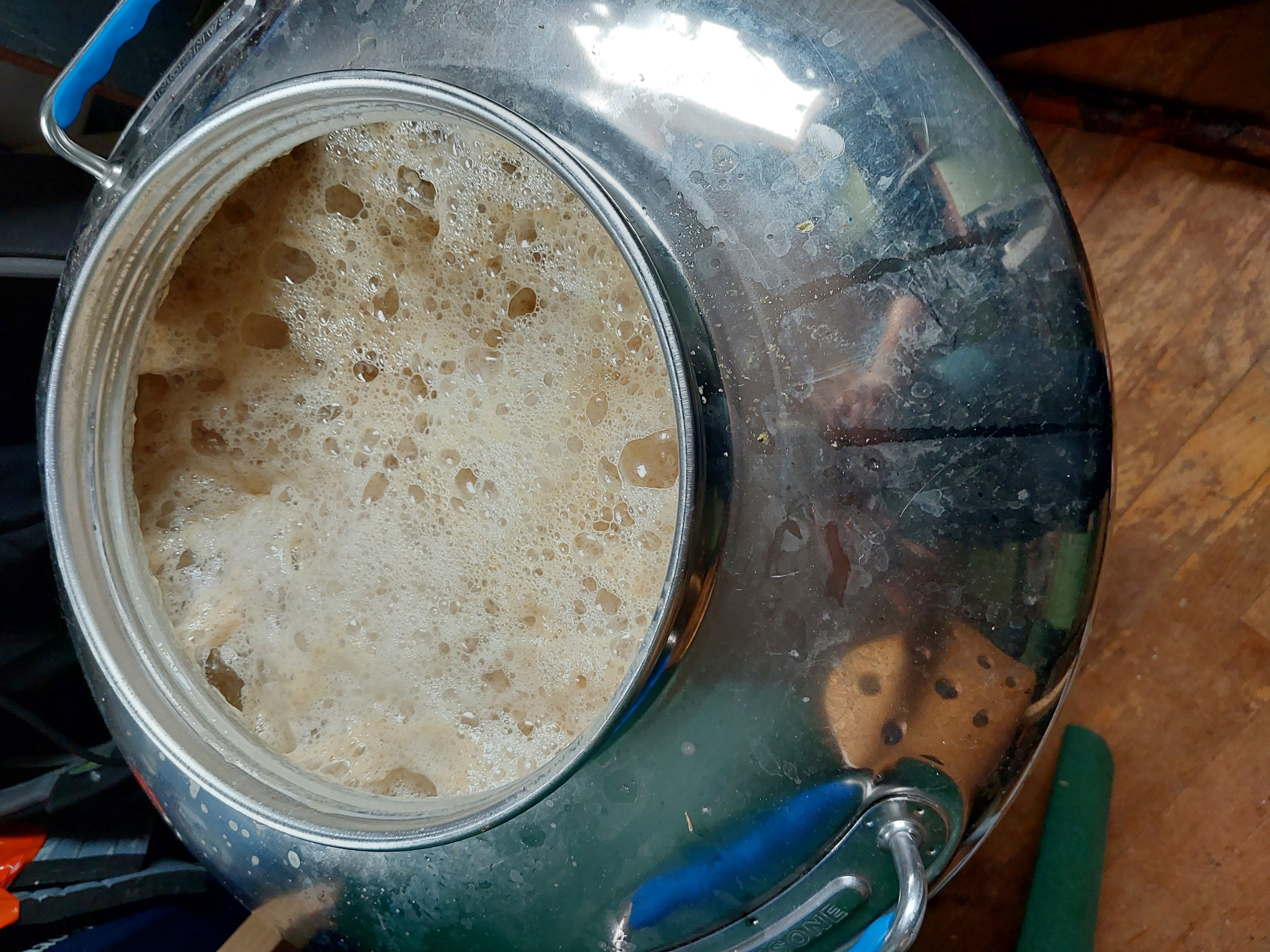 StW war 12,8 P, jetzt rd. 21 Stunden nach Anstellen laut Tilt bereits bei 11,1% RE, schöne Niederkräusen, Gärung voll im Gange.