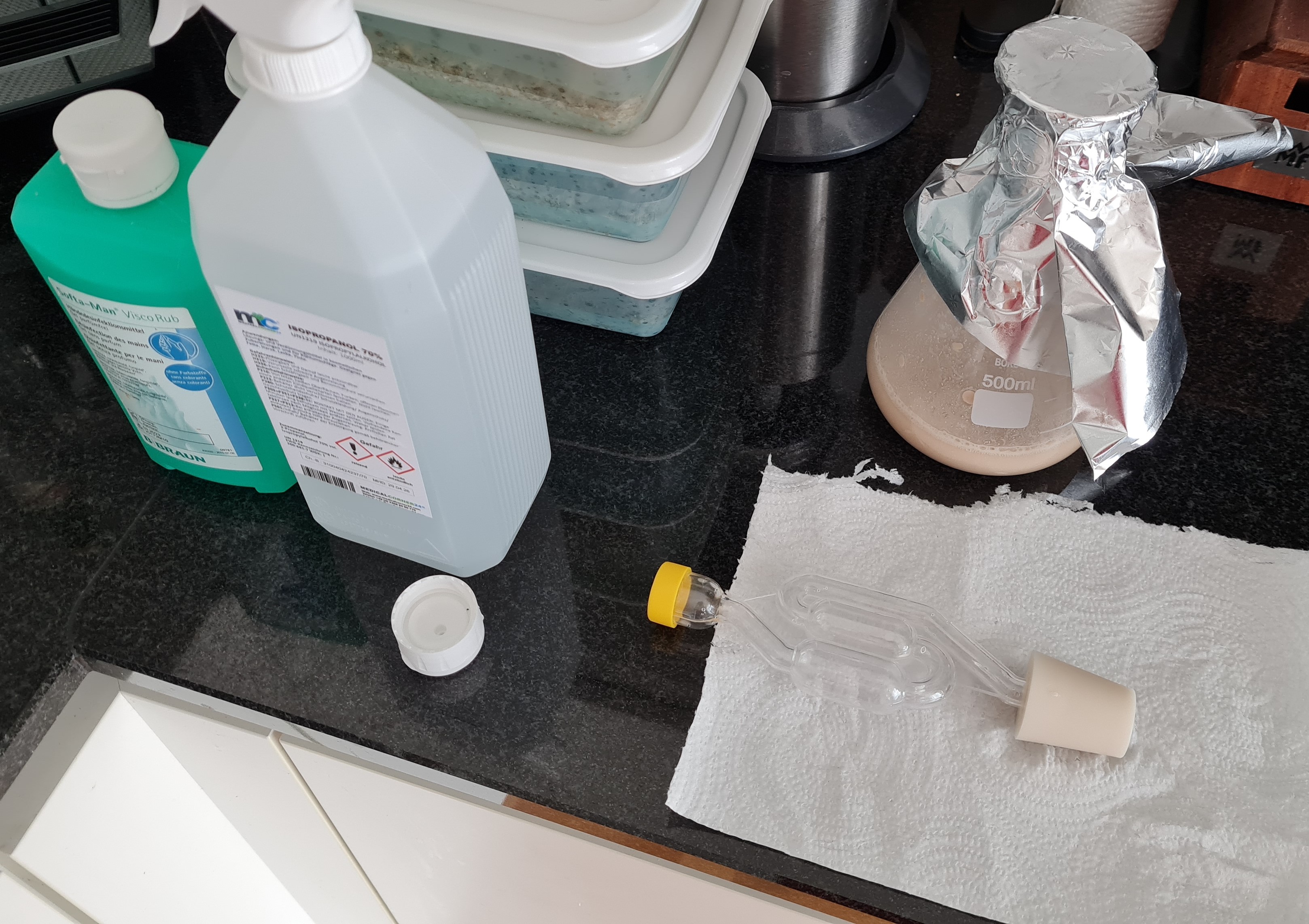 Das Rehydrieren der Trockenhefe war dann auch keine große Hexerei mehr. Natürlich wieder alles mit Desinfektion usw. und in einem Erlenmeyerkolben zubereitet.