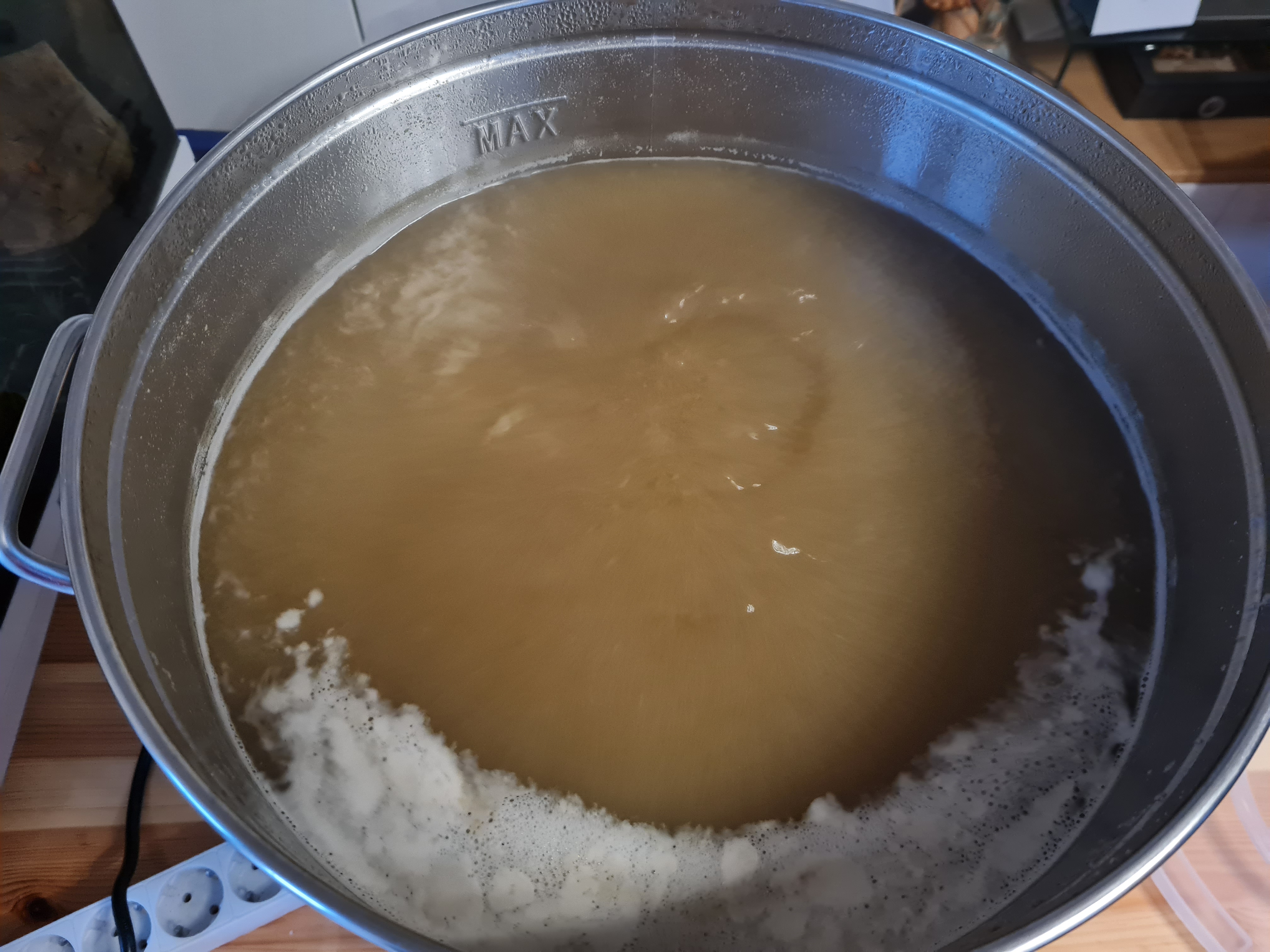 20:25 Uhr war der ganze Sud beim Kochen. Ich muss zugeben der Einkocher hat wirklich eine gute Leistung und brachte die ca. 25l gut zum Kochen. Die 700W schaltete ich wieder weg und es blubberte schön vor sich hin.