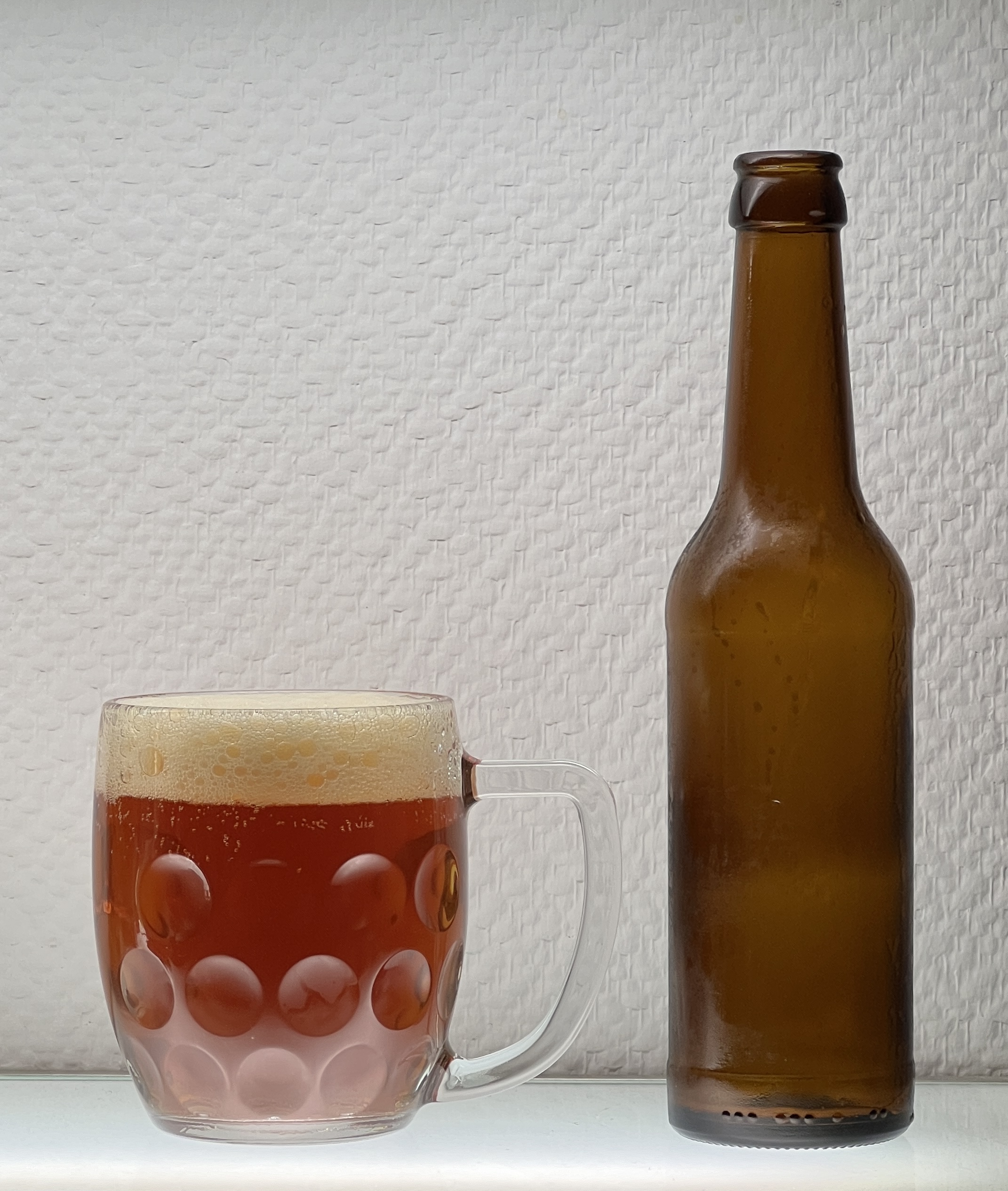 Schaum: extrem feinporig, sehr kleine, schneeweiße Perlen. Hält lang, legt sich dann als Deckel komplett über die Oberfläche. Ringe haften am Glas schließlich nach jedem Schluck.
