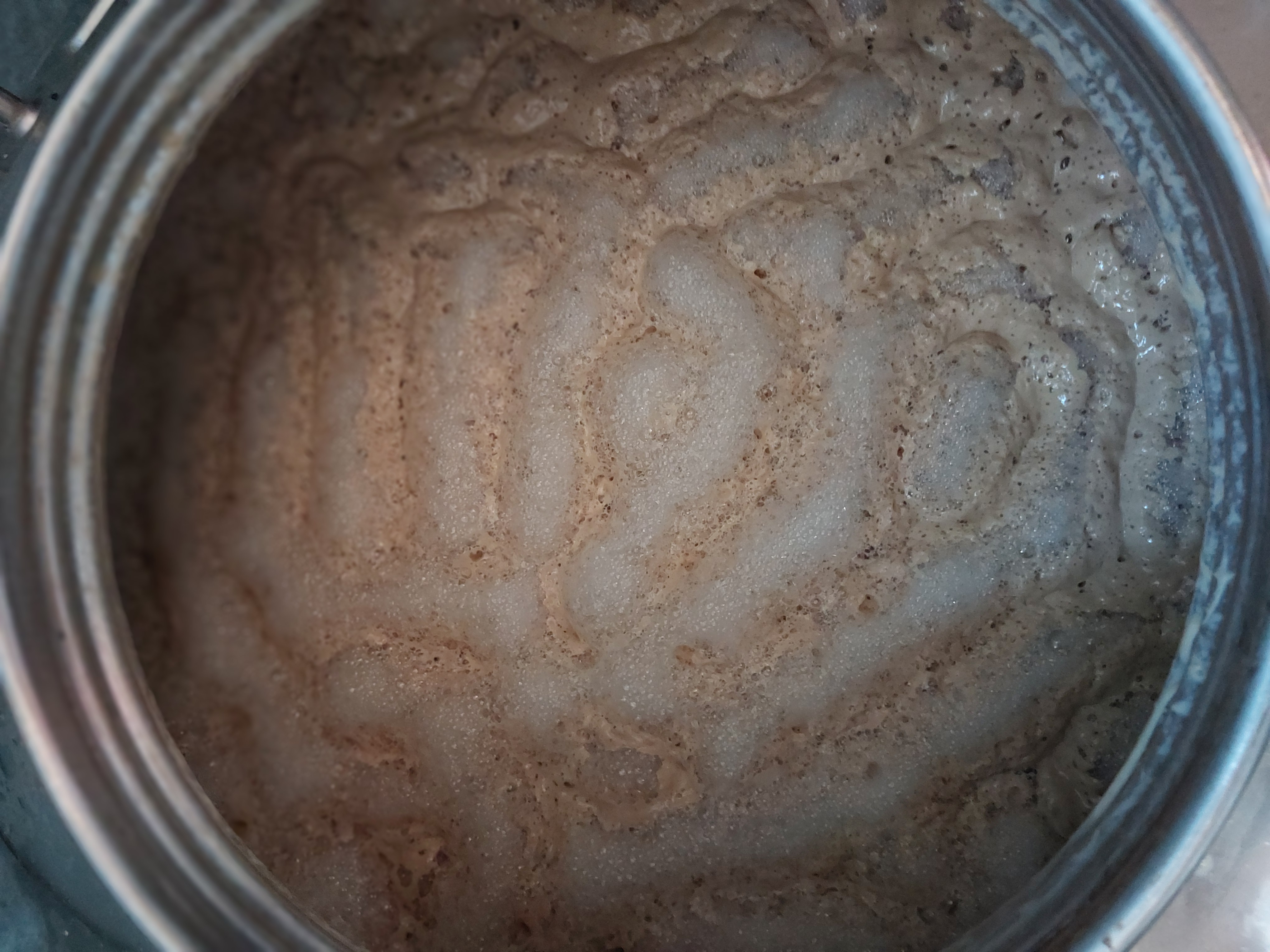 StW war 12,8 P, jetzt rd. 21 Stunden nach Anstellen laut Tilt bereits bei 11,1% RE, schöne Niederkräusen, Gärung voll im Gange.