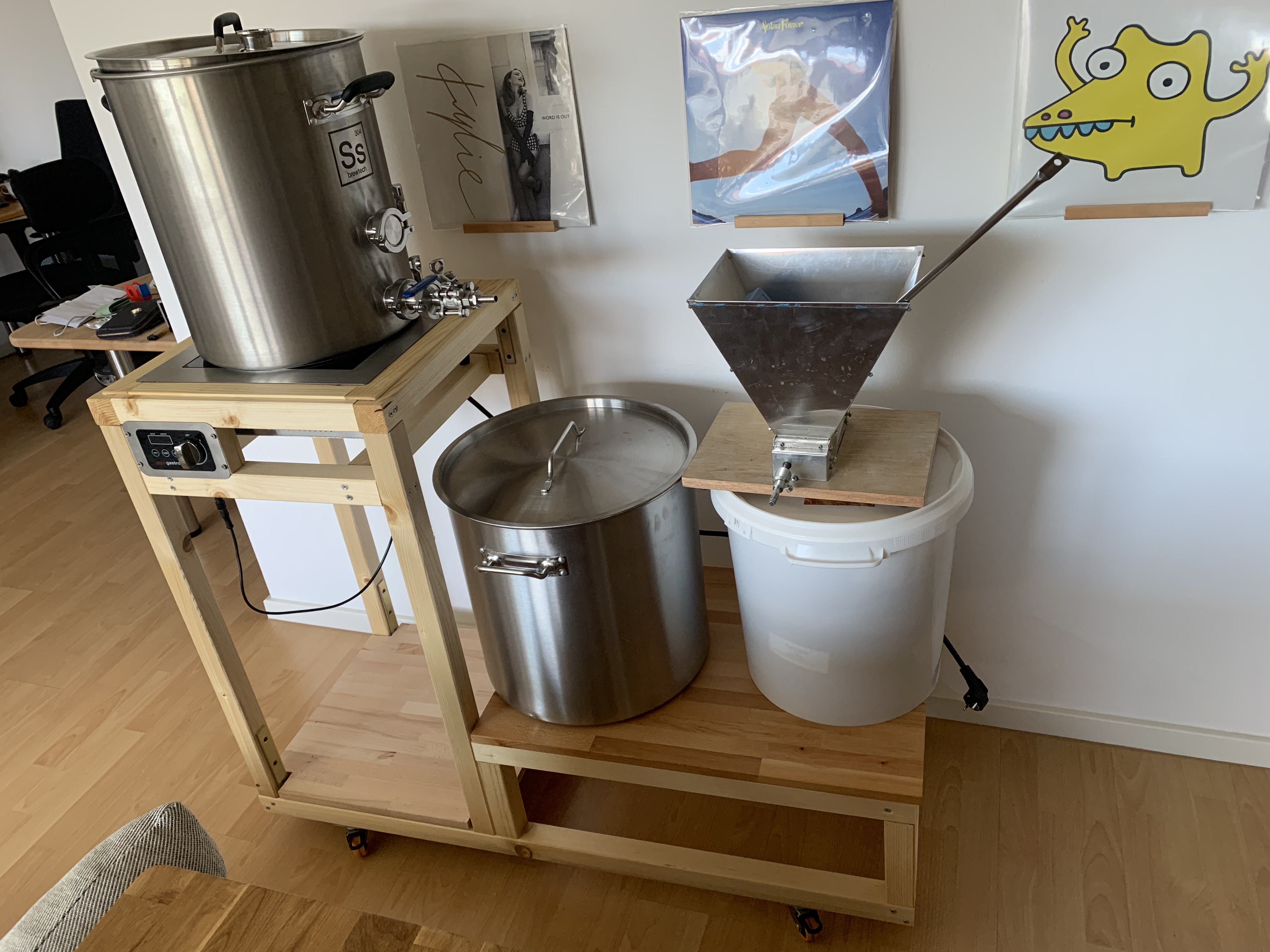 Ich habe mittlerweile mehr Platz, da ich nun in der Garage der neuen Wohnung brauen kann. Somit bekommt die Anlage bald einen dritten Topf, für das Nachgusswasser. Hierfür werde ich den SS-Brewtech Topf (38L) nehmen. Als Läuterbottich kommt dann der Topf zum Einsatz, welcher aktuell bei meinen Eltern steht (~55L Brewpaganda). Als Maischekessel kommt weiter mein großer Kessel (siehe letzter Beitrag) zum Einsatz. Aktuell suche ich daher nach einer Induktionskochplatte für die Nachgüsse und plane bereits das Gestell für den Anbau.