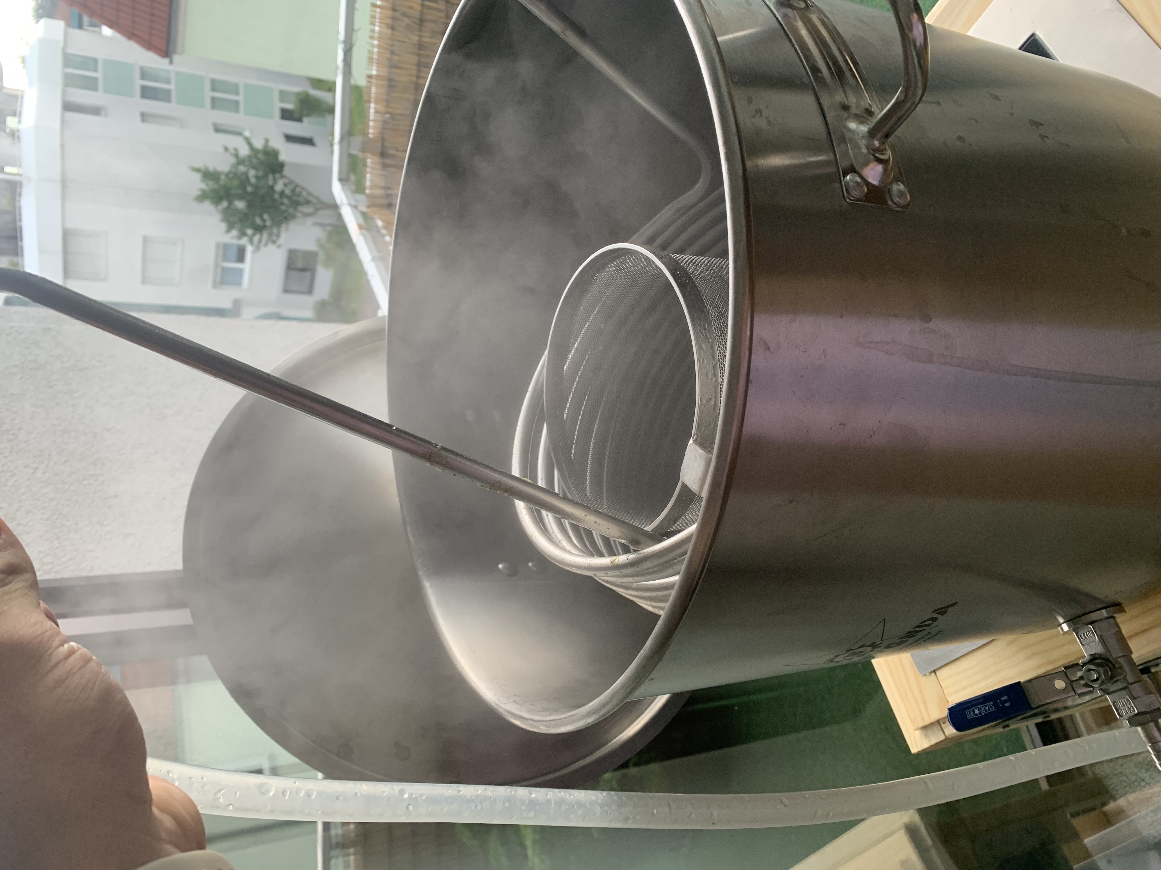 Ich habe dann einen Gardena Adapter an mein Waschbecken im Badezimmer angebracht und einen Schlauch in den Flur verlegt. Die Brauerei habe ich zum Kühlen dann einfach rüber geschoben :D