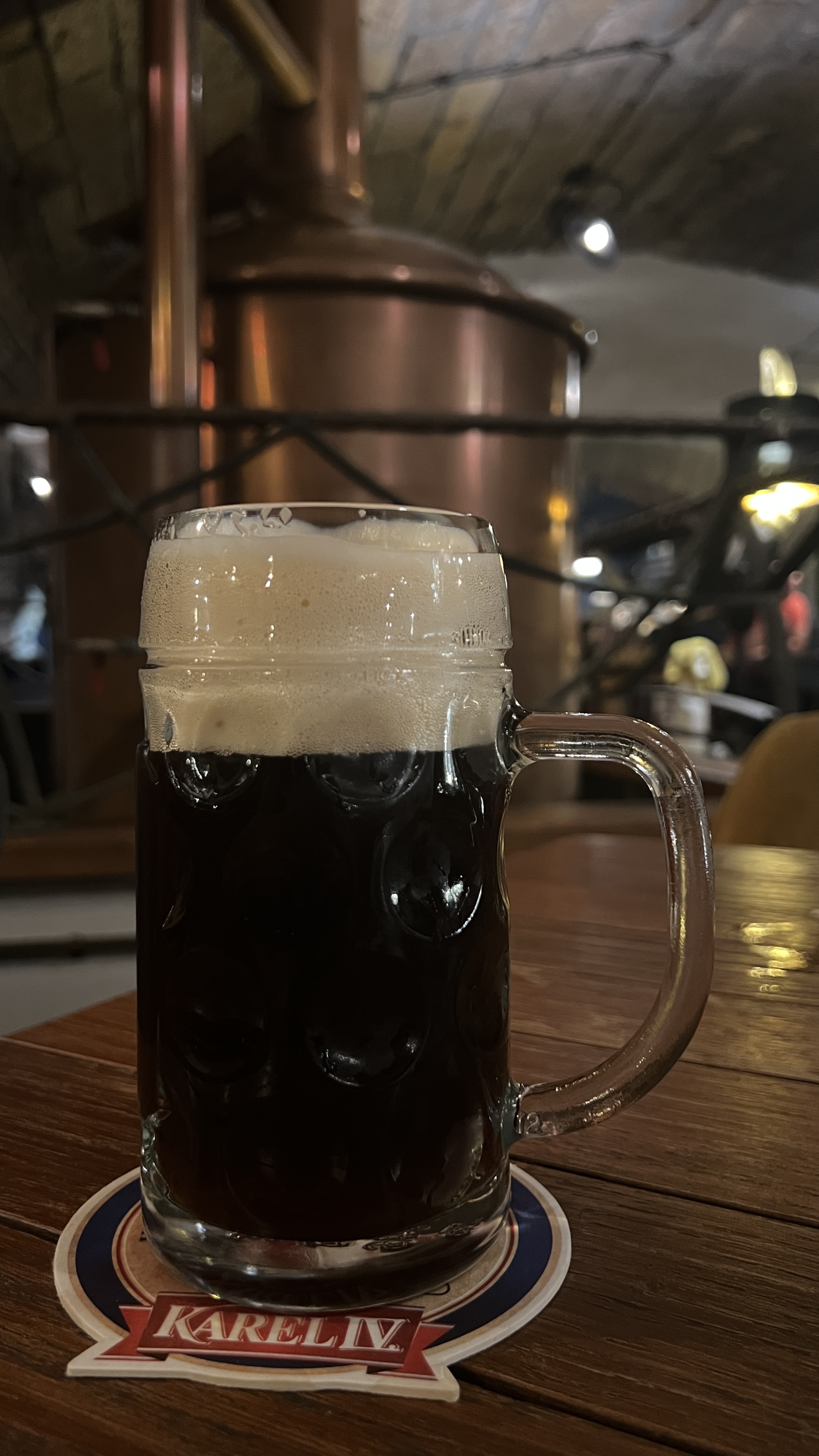 Die letzten beiden Biere in Tschechien. Ein Tmavé und ein Polotmavy Pivo bei Pivovar Karel IV in Karlsbad. Beide ok, aber ich habe in den letzten Tagen deutlich bessere Biere getrunken. Das hellere war nicht so schön clean wie andere Biere und hatte einen etwas hefigen Unterton. Das dunkle war etwas besser. Beide waren ziemlich trüb.