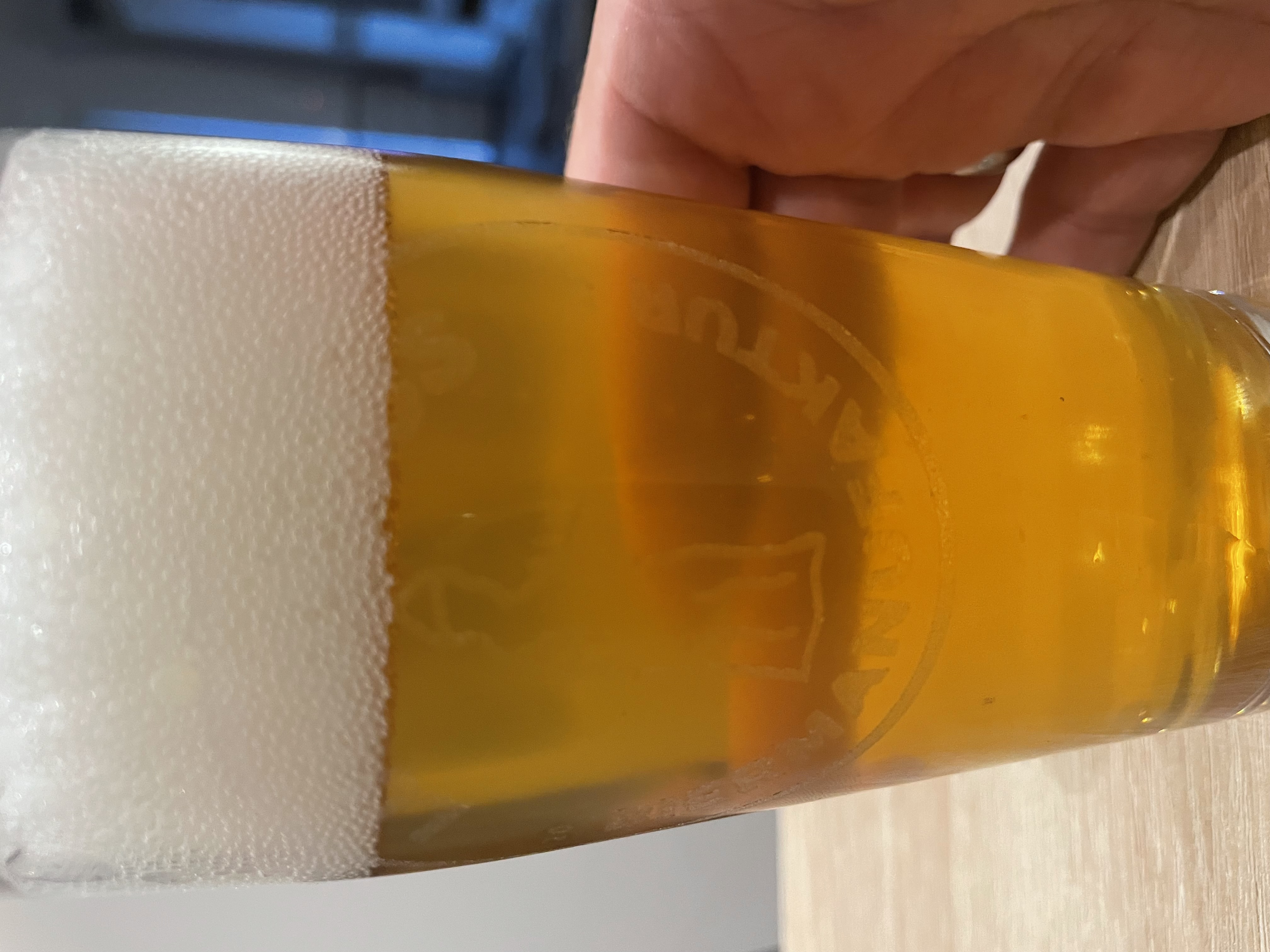 So. Bier ist jetzt fertig. Ich hatte es nach einer Woche von der Hefe genommen und dann mit Gelantine für 2 Tage in den Coldcrash und gleichzeitig zur Zwangskarbonisierung mit 30 PSI in den Kühlschrank gegeben.