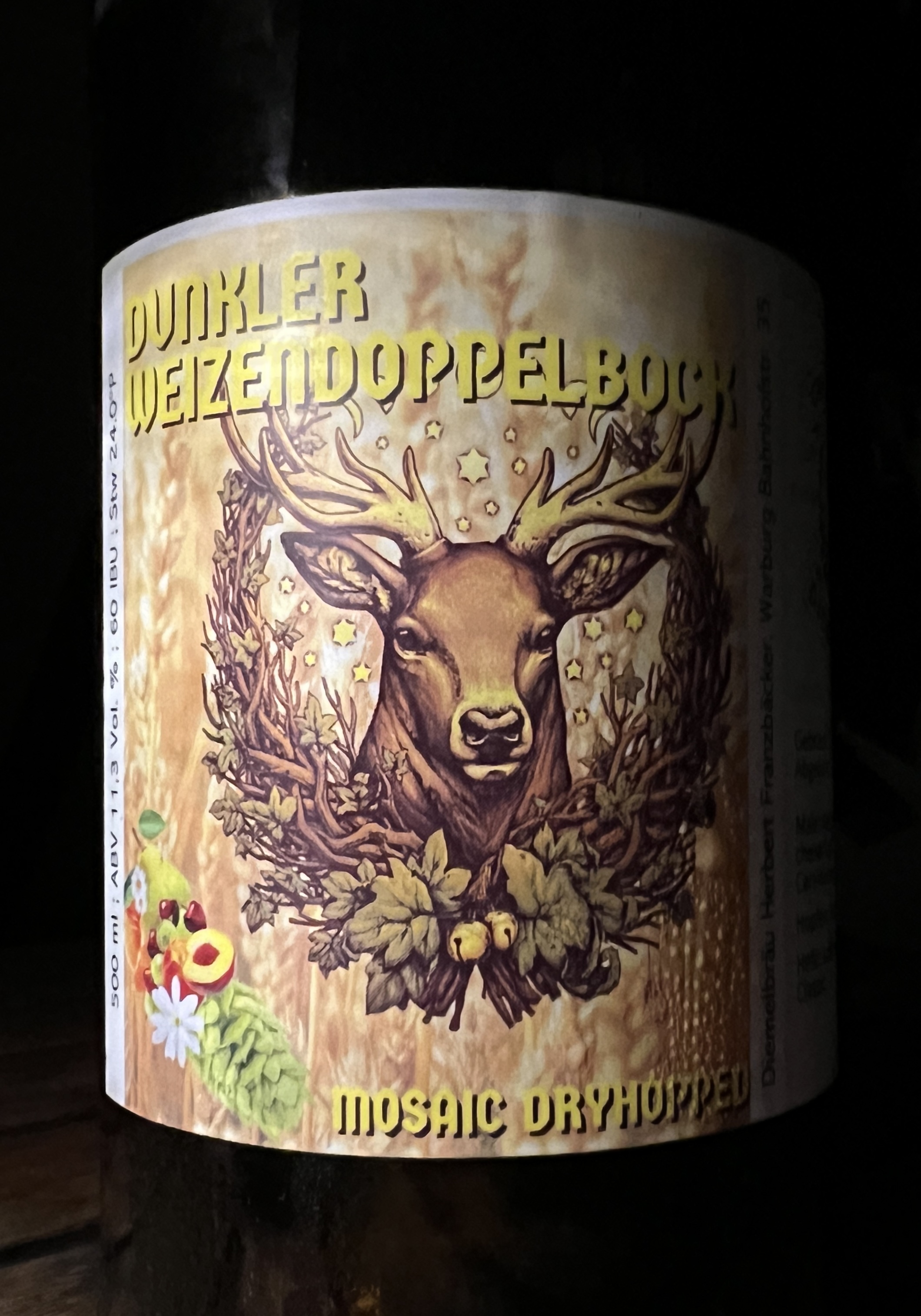 Einen wunderbaren dunklen Weizendoppelbock von Braukollege Herbert. Kaltgehopft mit Mosaic, eine schöne Komposition aus viel Malz und sanften fruchtigen Noten. Großes Kino! Danke für dieses wunderbare Bier. Mit zarten 11,3 % in der handlichen Halbliterflasche :Shocked