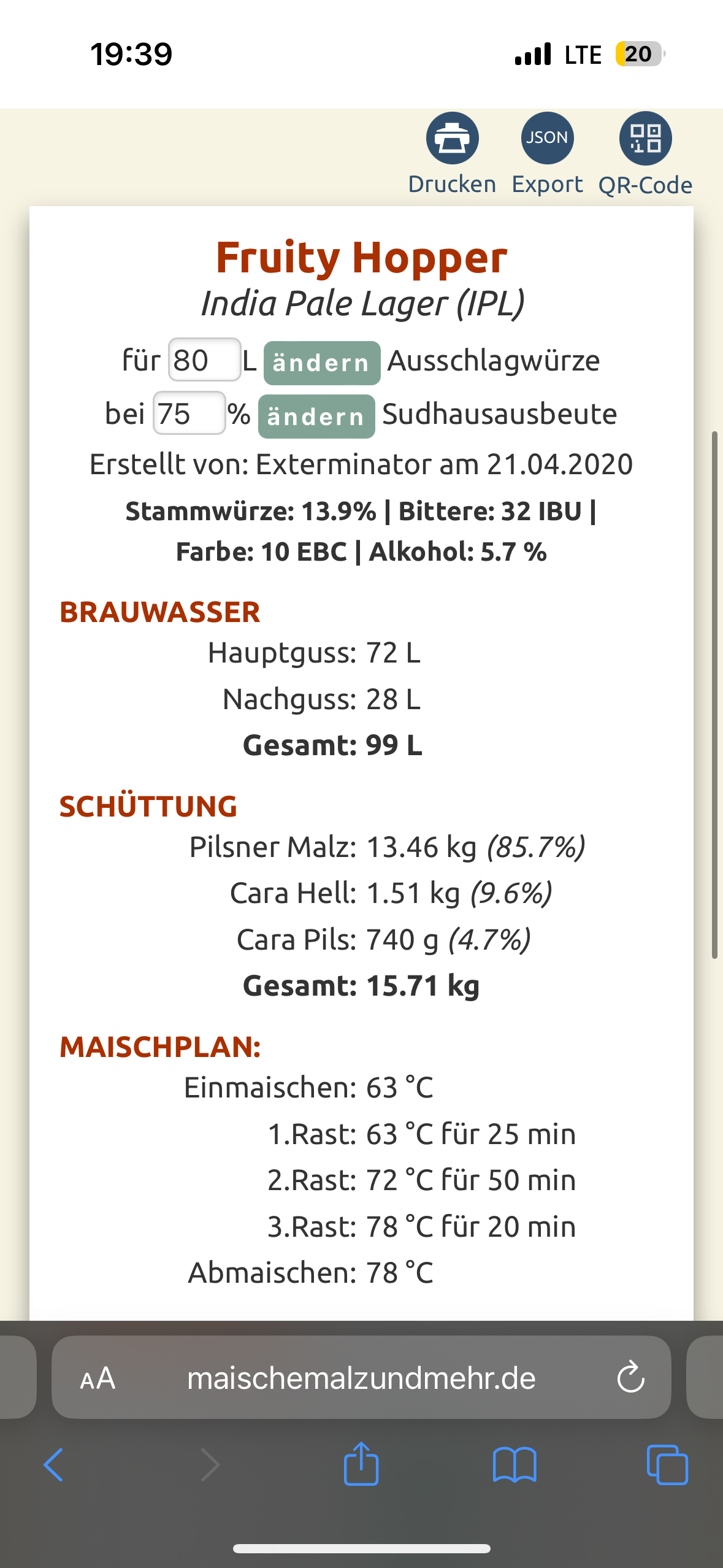 Nun wollt ich etwas mit weniger Hopfen probiern und mir sind folgende Unterschiede in der Berechnung von Brewfather und dem Rezept aufgefallen zB Alkohol ist komplett verschieden