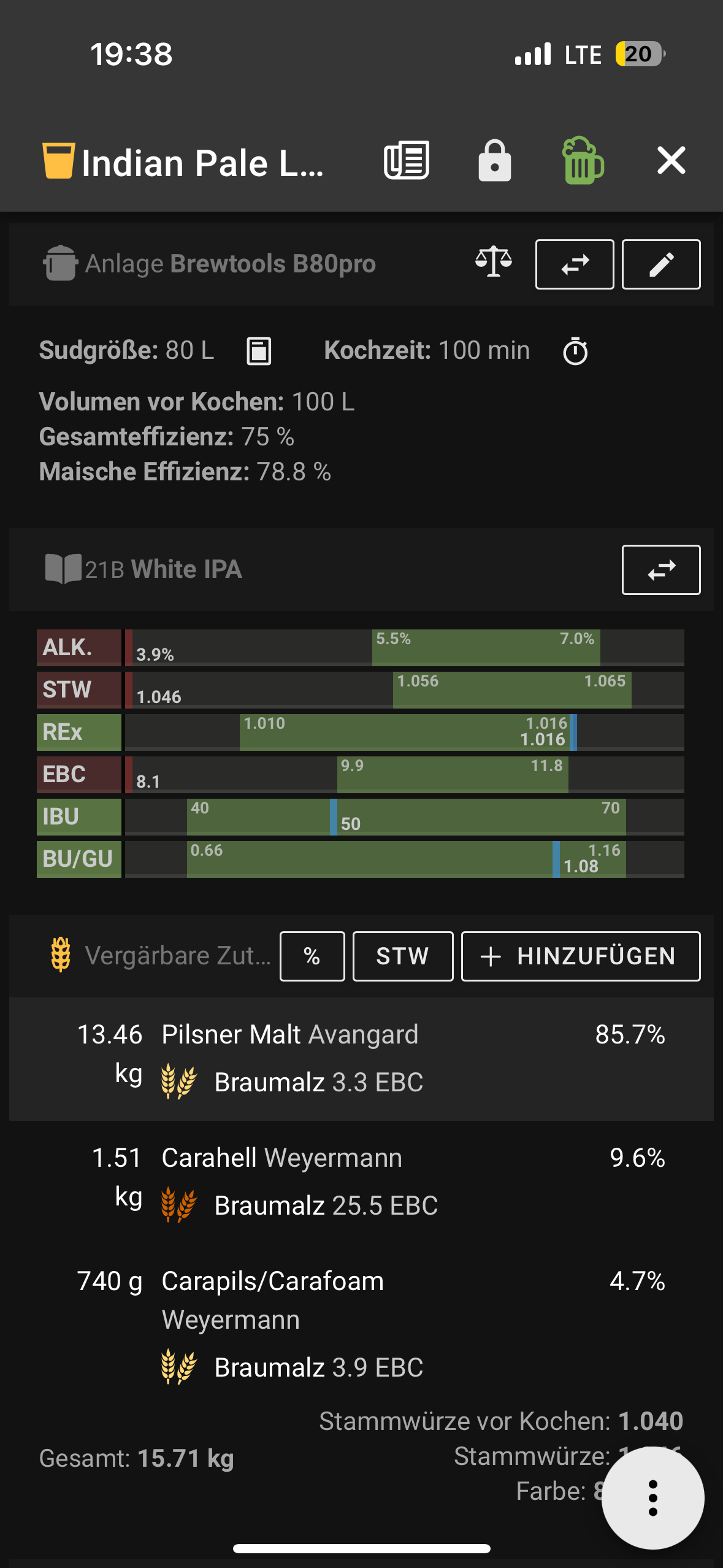 Hab ich einen Anwendungsfehler der App weil laut Brewfather müsste ich fast immer 18-20 Malz verwenden
