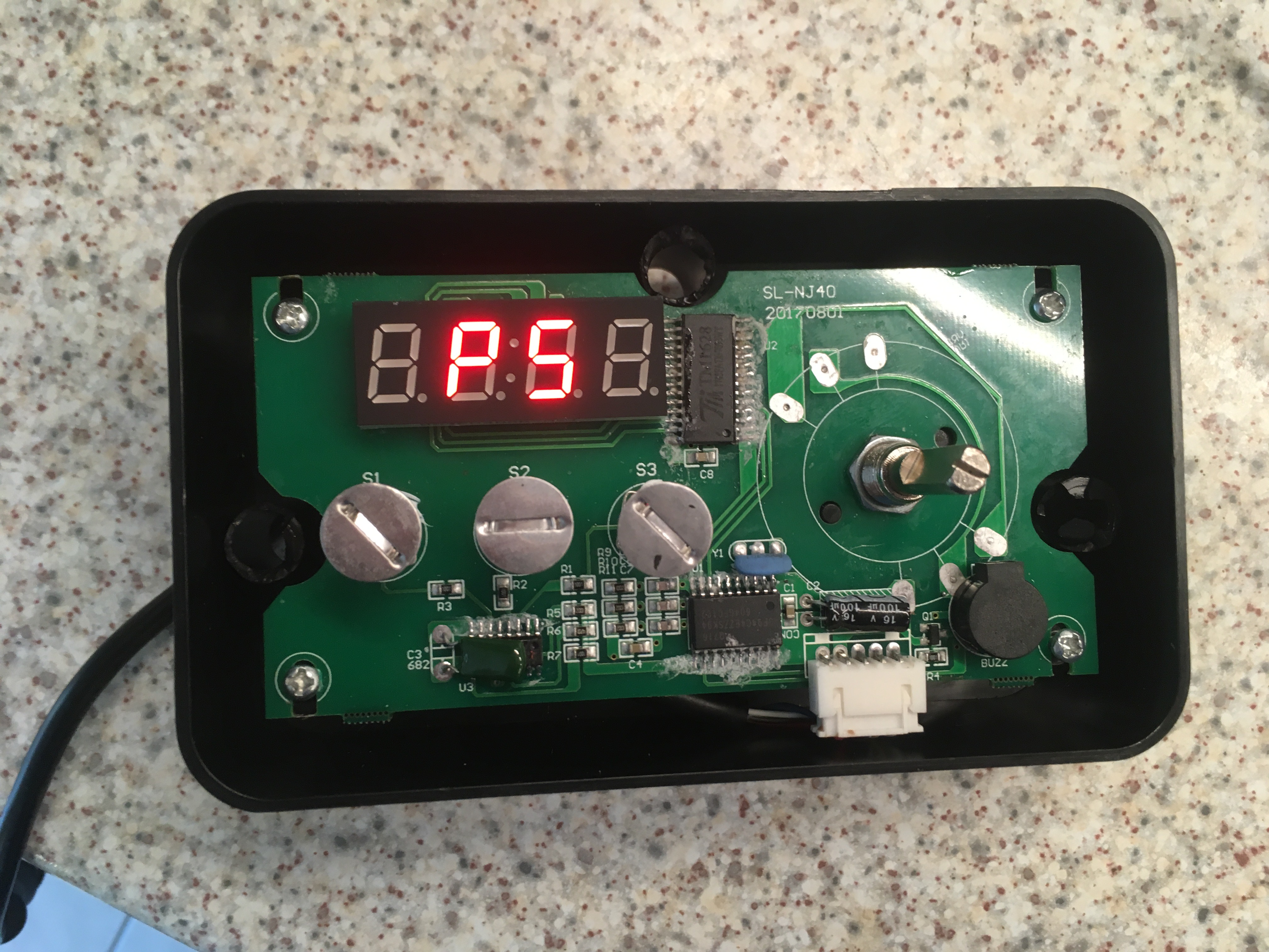 Die Steuerung funktioniert über ein Potentiometer, welches eine analoge Spannung an einen Mikrocontroller gibt. Dieser Stelle eine Stufe (Aus oder P1 bis P5) ein. Was danach passiert habe ich nicht geprüft, ich habe mich dazu entschieden über die Spannung die verschiedenen Poti-Stellungen zu simulieren.Die Datenblätter der verlöteten Microcontroller lassen aber eine Serielle Kommunikation mit der Platte vermuten, da auch Informationen (z.b. Fehlermeldungen) von der Platte zurückgemeldet werden können.