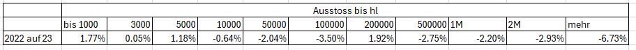 Schaue ich mit die veränderung des durchschnittlichen Ausstosses je Braustätte an und vergleiche 2022 mit 2023, sieht man eigentlich recht schön das gerade die grossen Brauereien verlieren, während die Kleinen Volumen gewinnen und das bei einem allgemein rückläufigen Biermarkt.