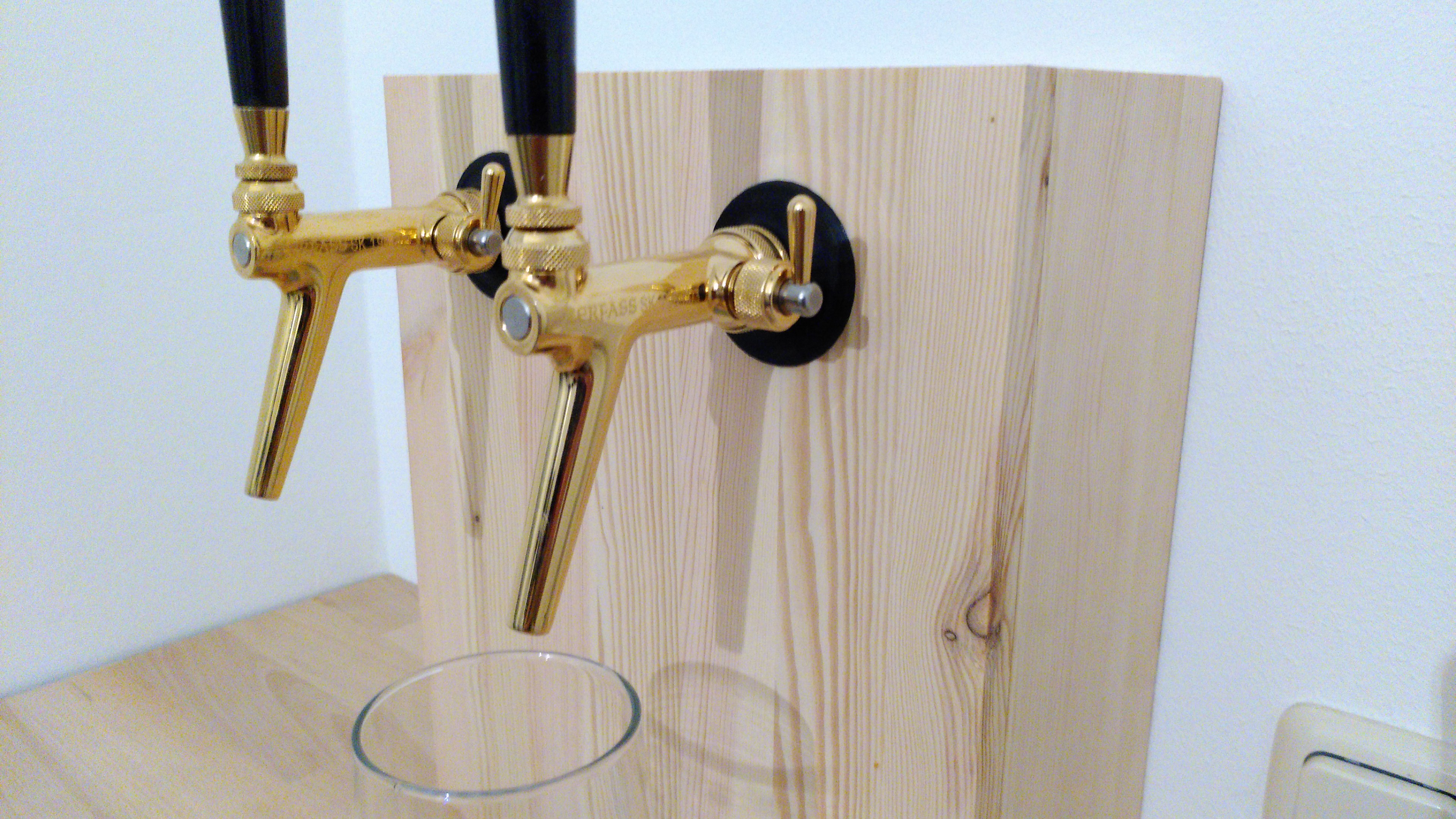 Im Verlauf der Monate holte ich mir diverse weitere Kegs (10L und 5L) und stellte fest, dass maximal zwei 10L-Kegs (vorne) plus zwei 5L-Kegs (hinten) in diesen Kühlschrank passen. Daher habe ich zwei weitere Kompensatorhähne samt Zubehör montiert, indem ich zwei Eichenholzstücke so zugeschnitten und am Zapfturm befestigt habe, dass die Hähne auf gleicher Höhe der beiden ursprünglichen Hähne sind.