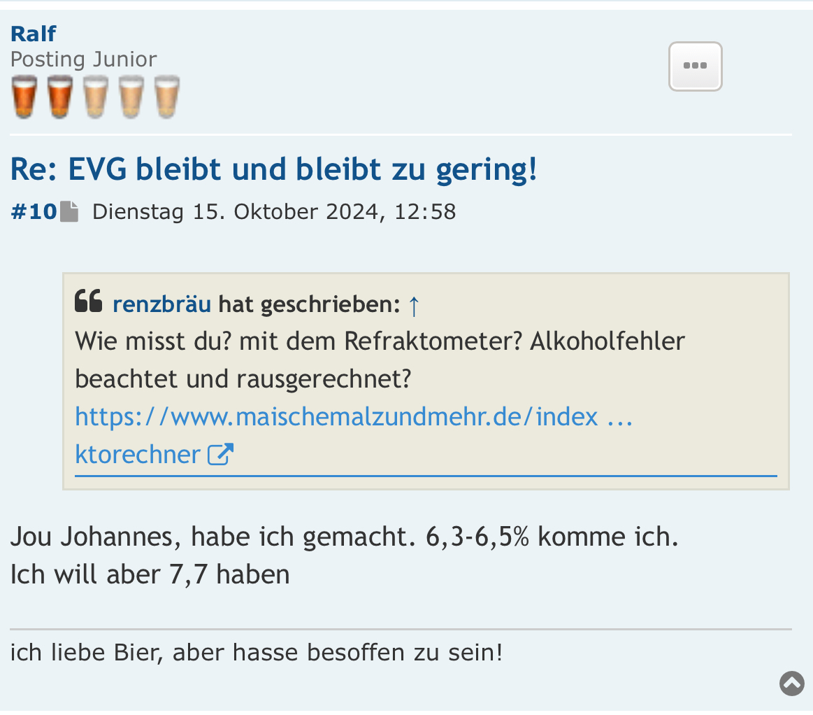 Jou Johannes, habe ich gemacht. 6,3-6,5% komme ich.renzbräu hat geschrieben: Dienstag 15. Oktober 2024, 12:32 Wie misst du? mit dem Refraktometer? Alkoholfehler beachtet und rausgerechnet?