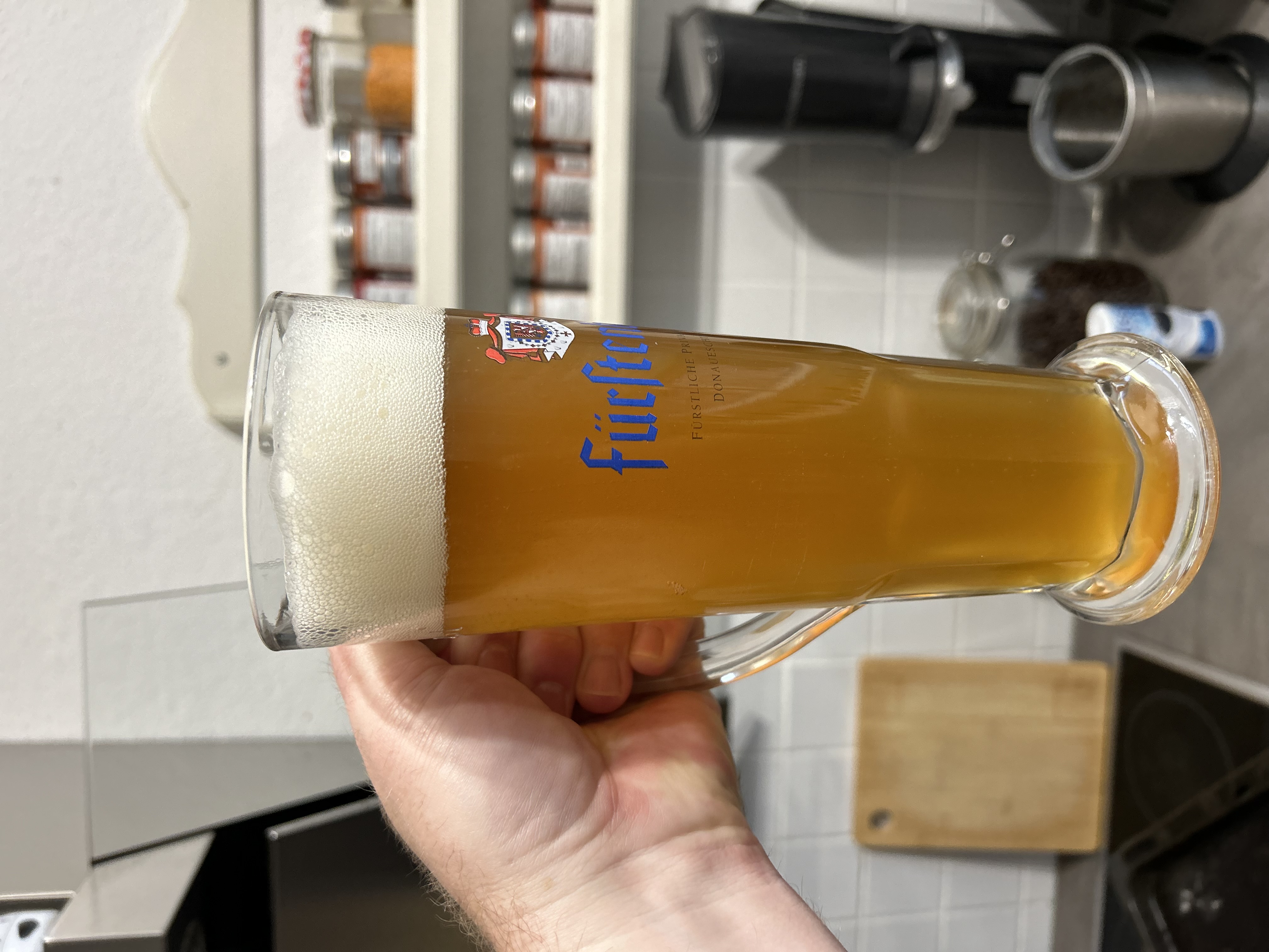 Das Manometer zeigt mittlerweile knackige 4 bar bei 20 Grad Umgebungstemperatur an. Wir hatten ja verifiziert, über Spindel und Refraktometer sowie Plausibilisierung durch Deine Berechnung, dass die Gärung abgeschlossen sein muss. Auch war beim Öffnen der Flasche kein Gashing und kein riesiger Plopp. Da hatte ich schon andere Biere, die deutlich mehr geknallt haben und weniger Druck hatten. Beim Trinken war es schon relativ stark perlend und gut karbonisiert.
