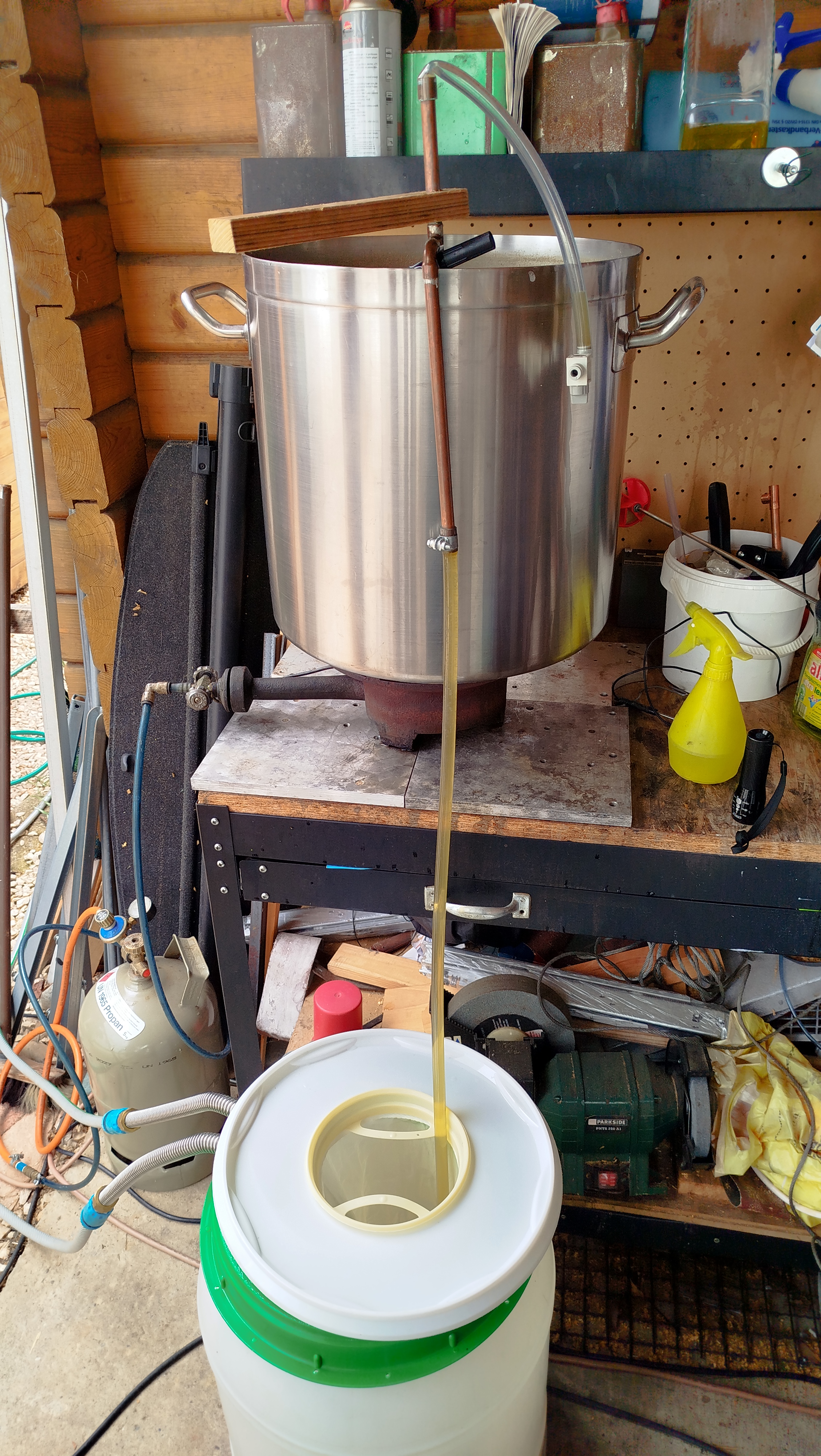 Mit diesem Setup braue ich momentan 45l Ausschlagwürze. Vor dem 40l Thermoport als Läuterbottich benutzte ich einen 30l Hobbock.