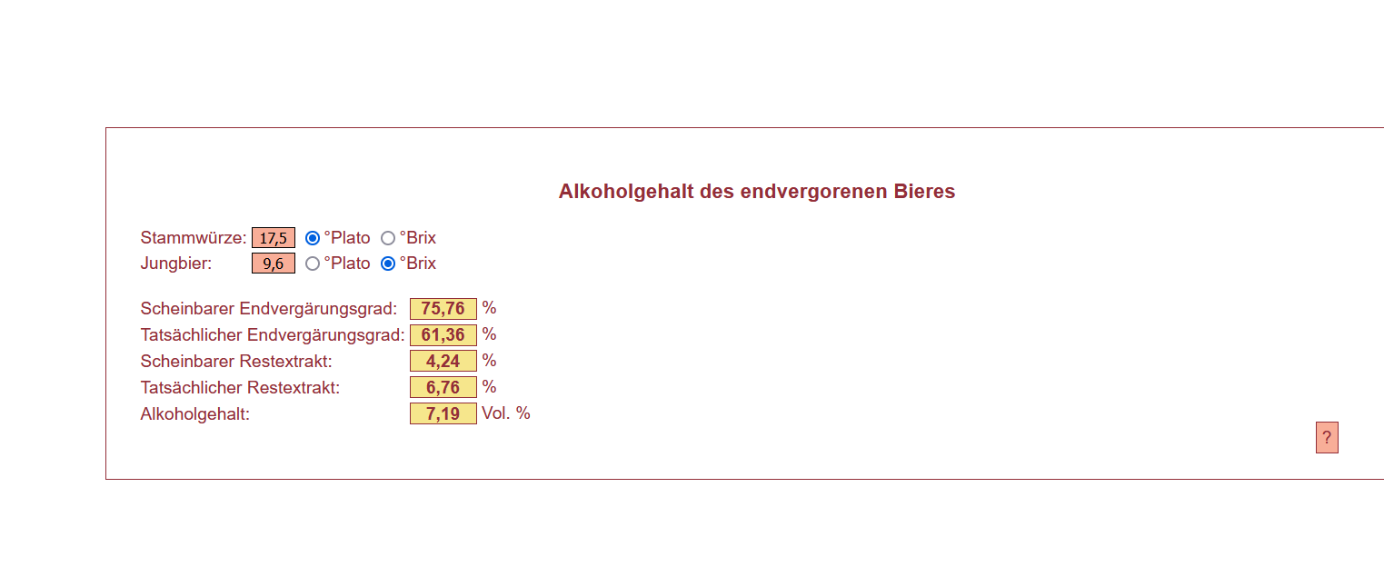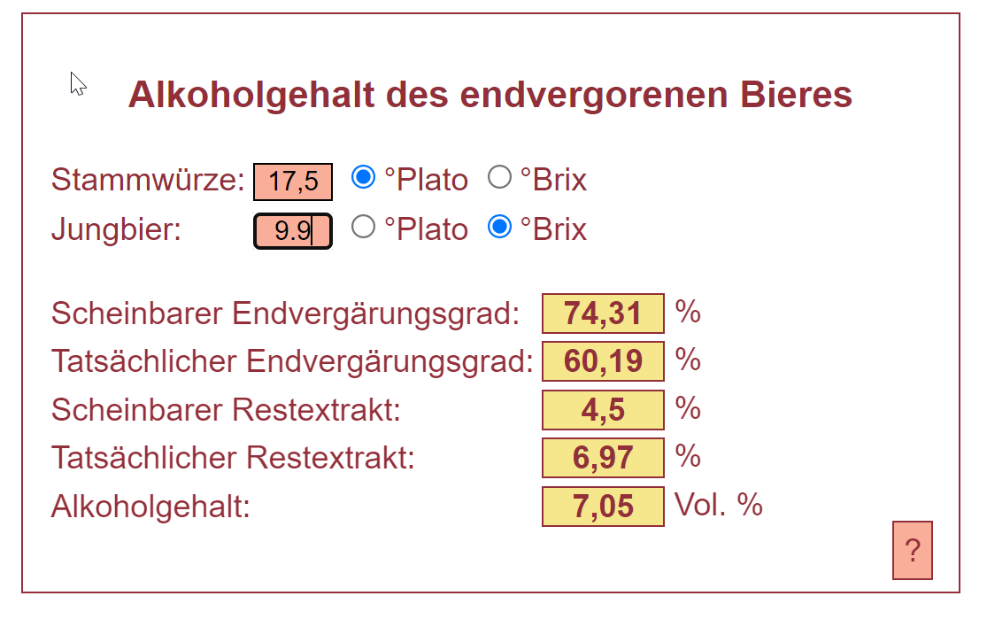 Während der Gärung und vor allem wenn sich dann der Bx%-Wert nicht mehr ändert, werden die Werte in Online-Tools mit den beiden üblichen Modellen (