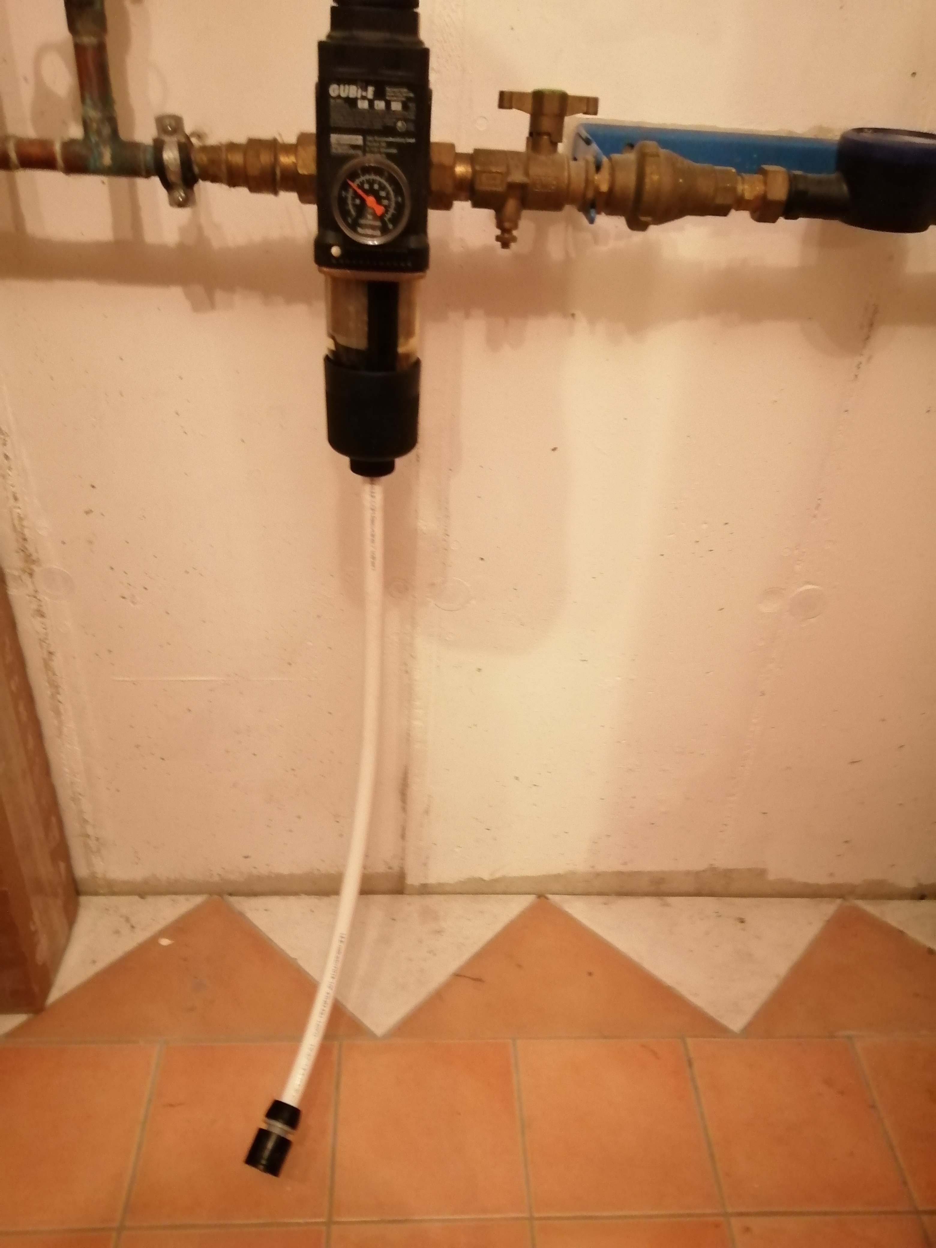 Mein Zugang zum Kühlwasser ist der Druckminderer. Einmal mit der Würze durch den Kellerflur, Spirale (heute bestellt) rein und los gehts.