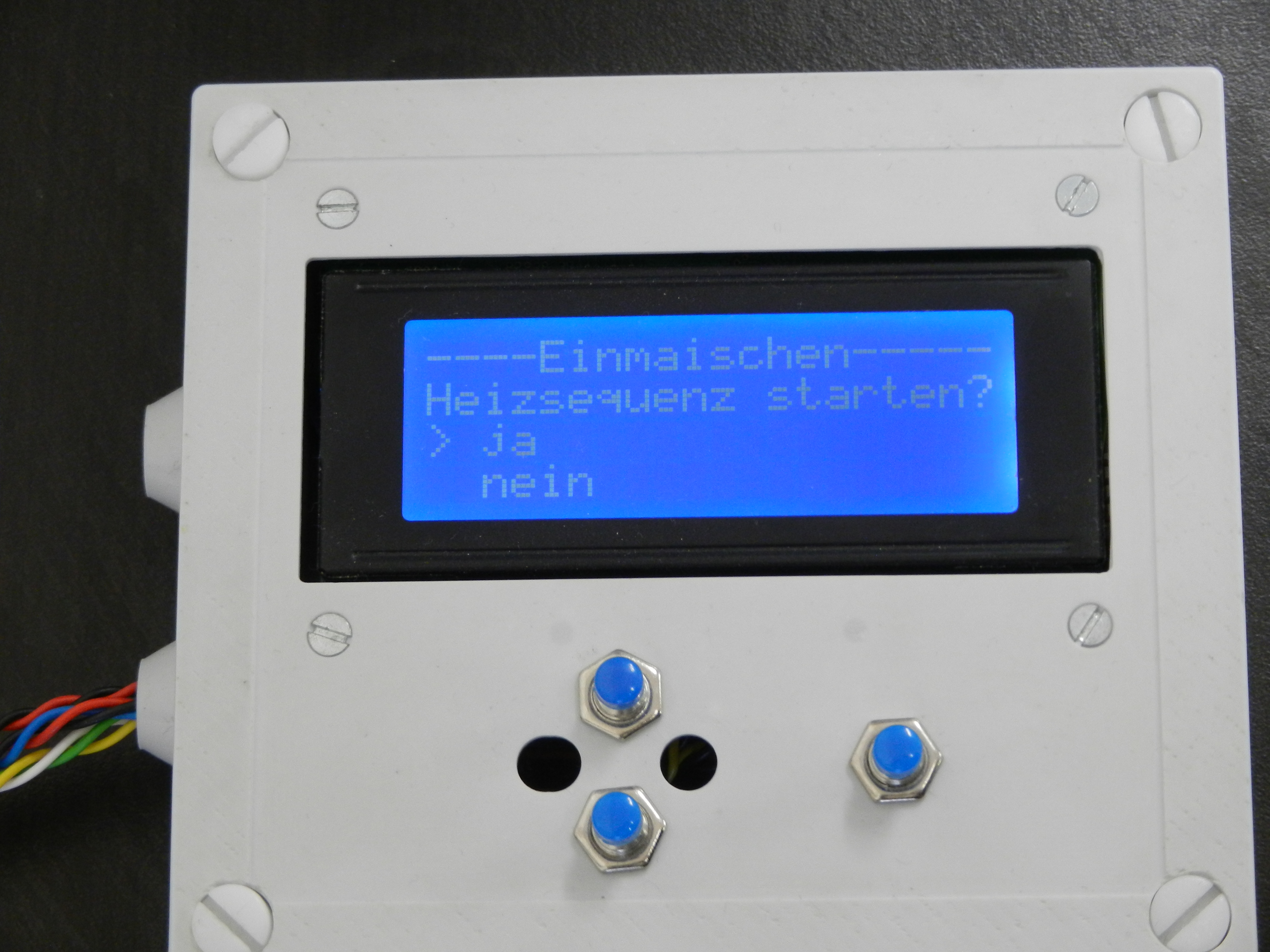 Das war unsere Hardware auf die wir dann aufgebaut haben. Das letzte Rezept bleibt immer im Speicher. Damit die Temperatur beim Maischen auch gut getroffen werden kann mußte die Hysterese in 0.1 Grad Schritten angepaßt werden. Das wurde dann in der Menüführung integriert.