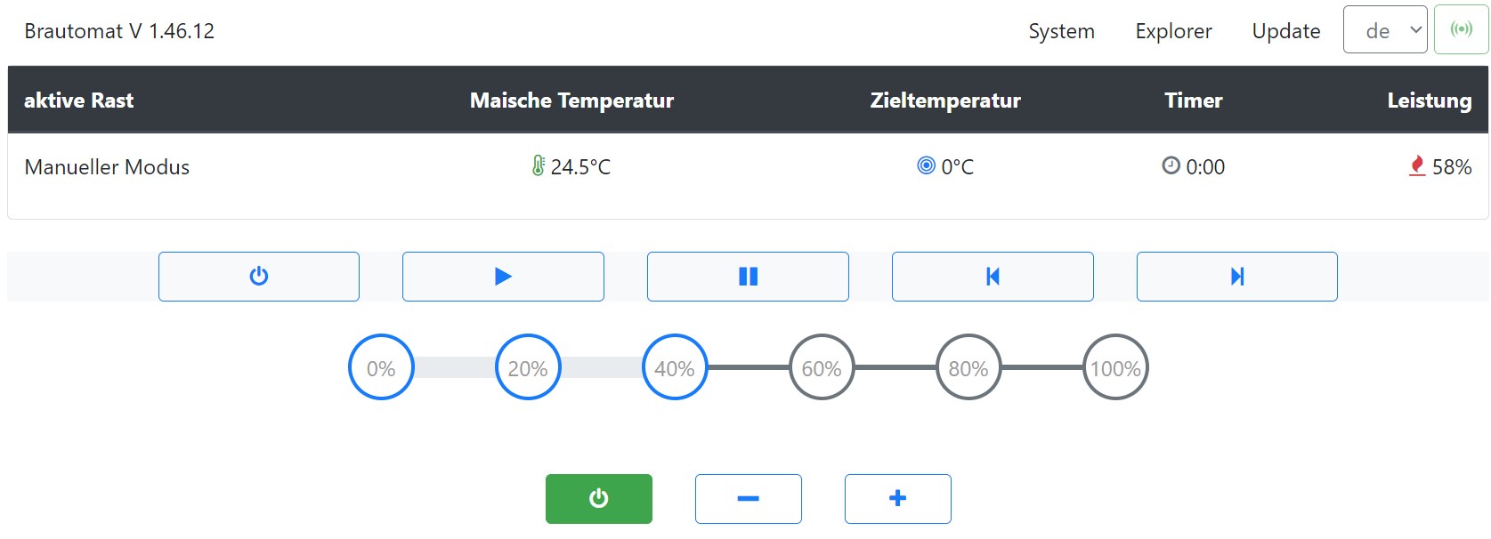 Die letzte Sonderfunktion IDS:xxx aus dem Maischeplan wird auf den globalen Wert (Max. Leistung IDS) zurück gesetzt, wenn man die Stromzufuhr unterbricht (ESP32 merkt sich sonst alles brav) oder man einschlägige Parameter in den Einstellungen während des Betriebs verändert.