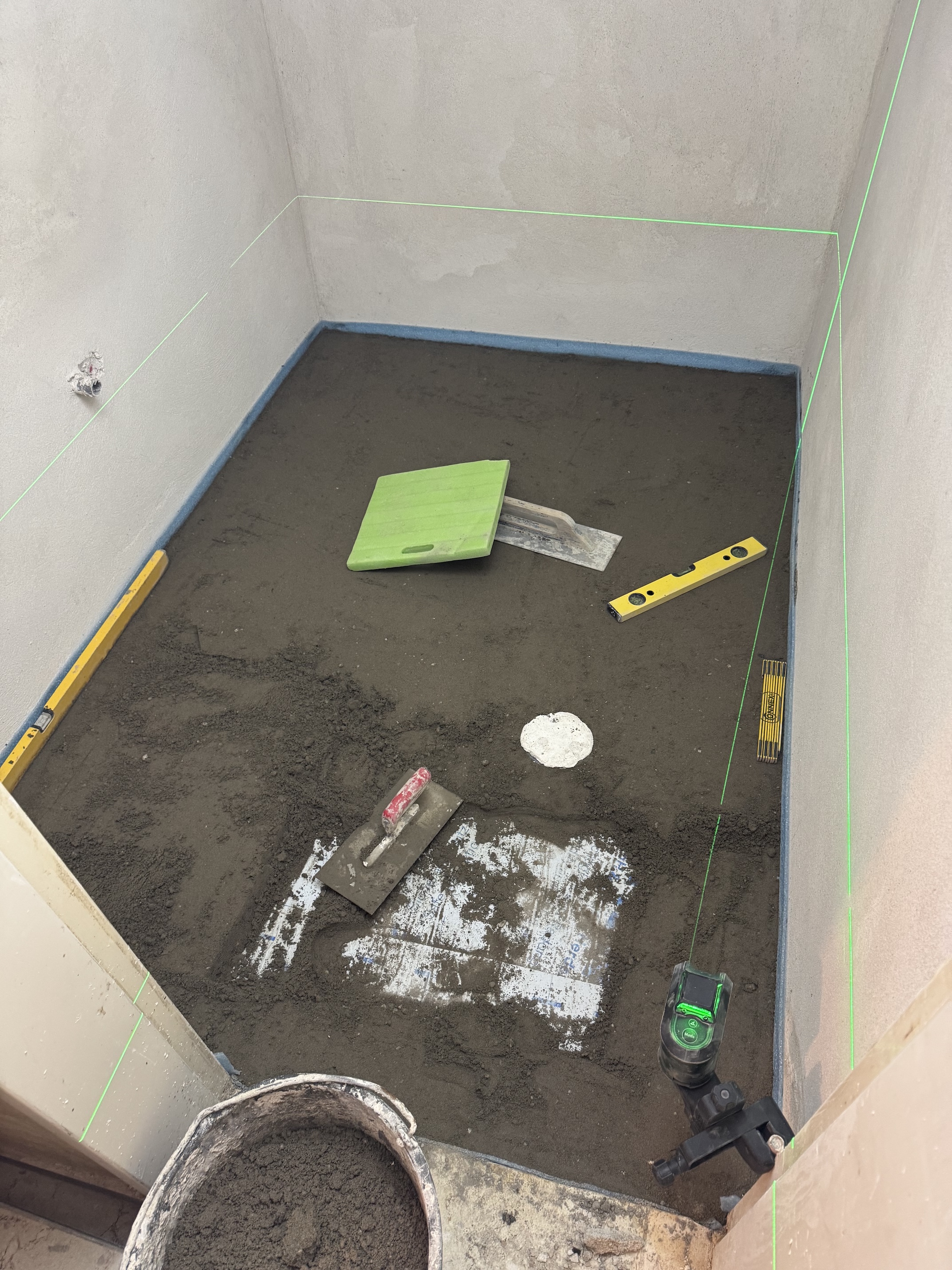 Erste Amtshandlung war dann erstmal einen Estrich zu verlegen, mit Gefälle zum Ablauf: