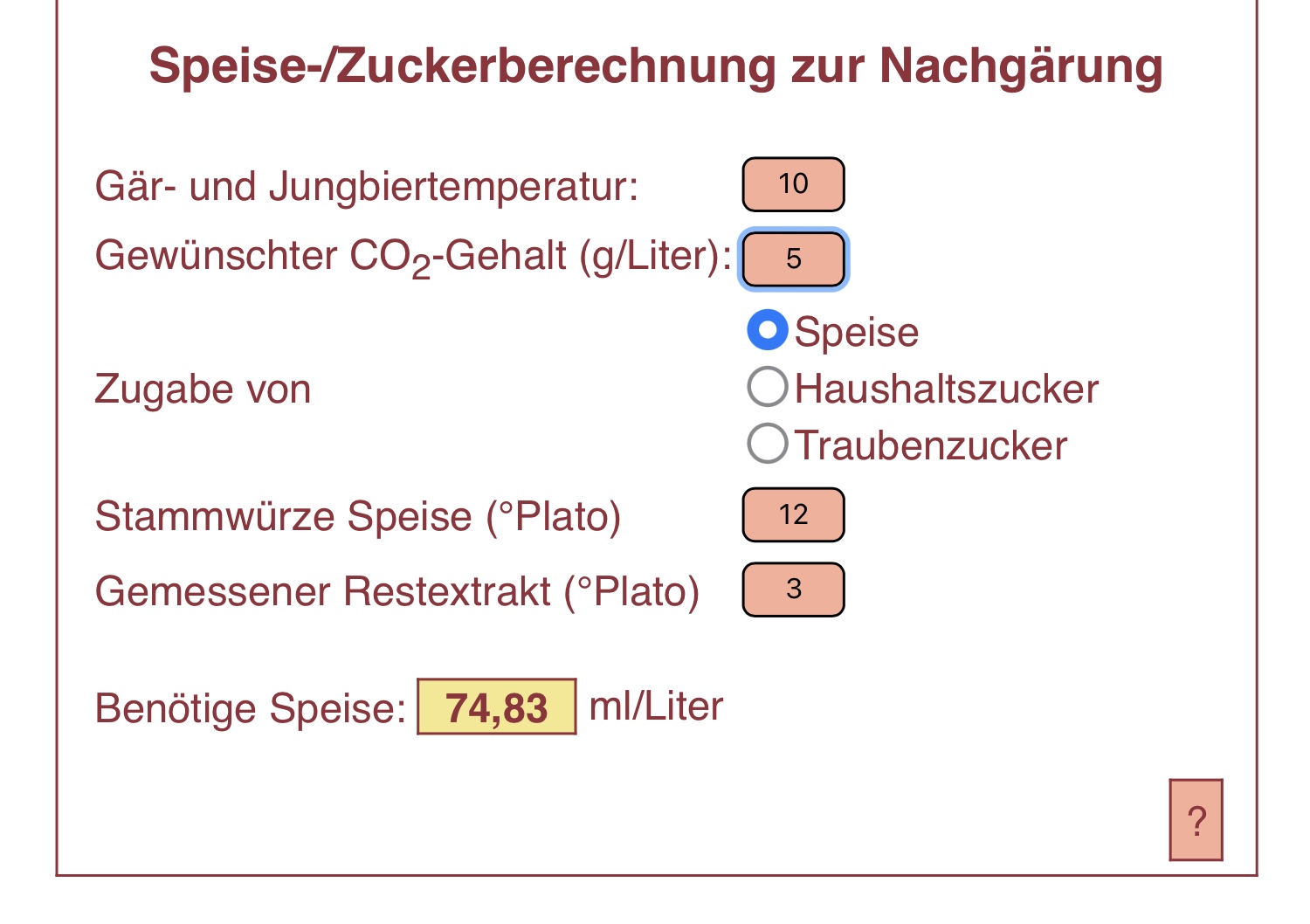 Im Beispiel „Stammwürze 12 Grad Plato, 3 Grad Plato gemessener Restextrakt“ ergibt sich 1g Zucker oder 14ml Speise bei der angegebenen Jungbier-Temperatur und dem Ziel-CO2-Gehalt von 5g/Liter.
