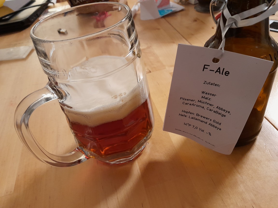 Der Erste Schluck; weniger Malzig als ich es erwartet habe, die Bittere ist eher zurückhaltend, aber es hat eine deutlich hopfige, würzig frische Note, gefällt mir. Obwohl ich das Original Bier, also zumindest das Steam Bier der Anchor Brewery schon öfters getrunken habe, hätte ich dies nicht zusammengebracht. Aber das gefällt mir besser, da es hopfiger ist. Ich habe noch nie mit Northern Brewer gebraut, aber ich werde mich den Hopfen mal besorgen. Die Bitter ist nicht sehr bitter aber sehr langanhaltend. ein sehr frisch wirkendes Bier.