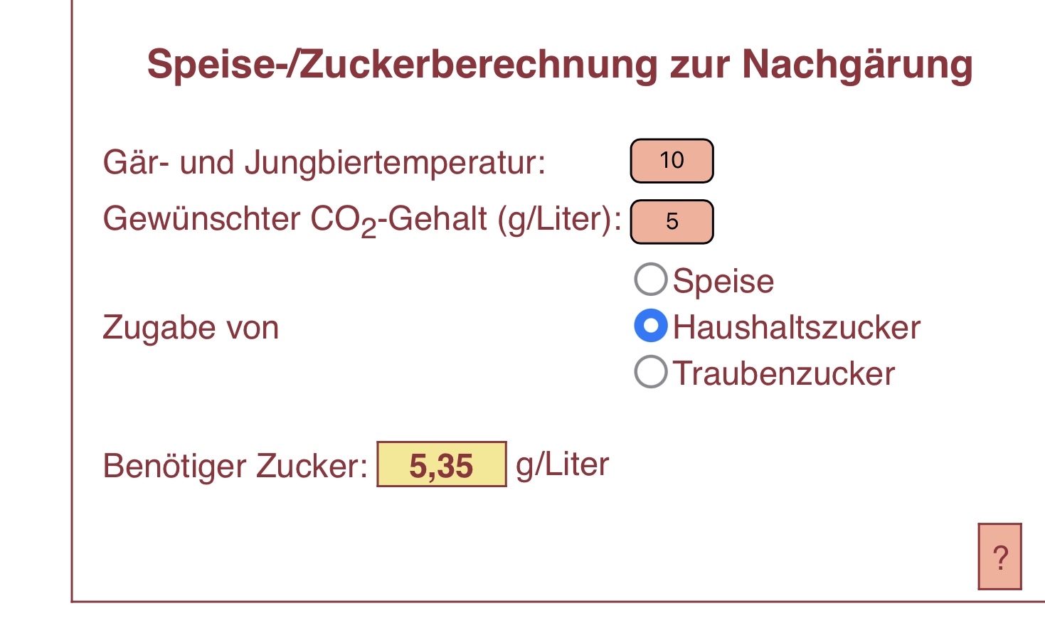 Im Beispiel „Stammwürze 12 Grad Plato, 3 Grad Plato gemessener Restextrakt“ ergibt sich 1g Zucker oder 14ml Speise bei der angegebenen Jungbier-Temperatur und dem Ziel-CO2-Gehalt von 5g/Liter.