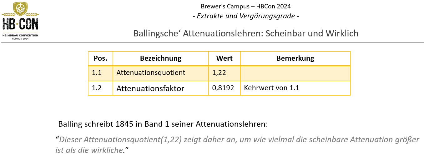Erklärung: Dahinter steckt die Formel zur Berechnung des Vergärungsgrades(I.) und der Ballingsche' Attenuationsfaktor 0,8192, der aus "scheinbar" ein "wirklich" macht.