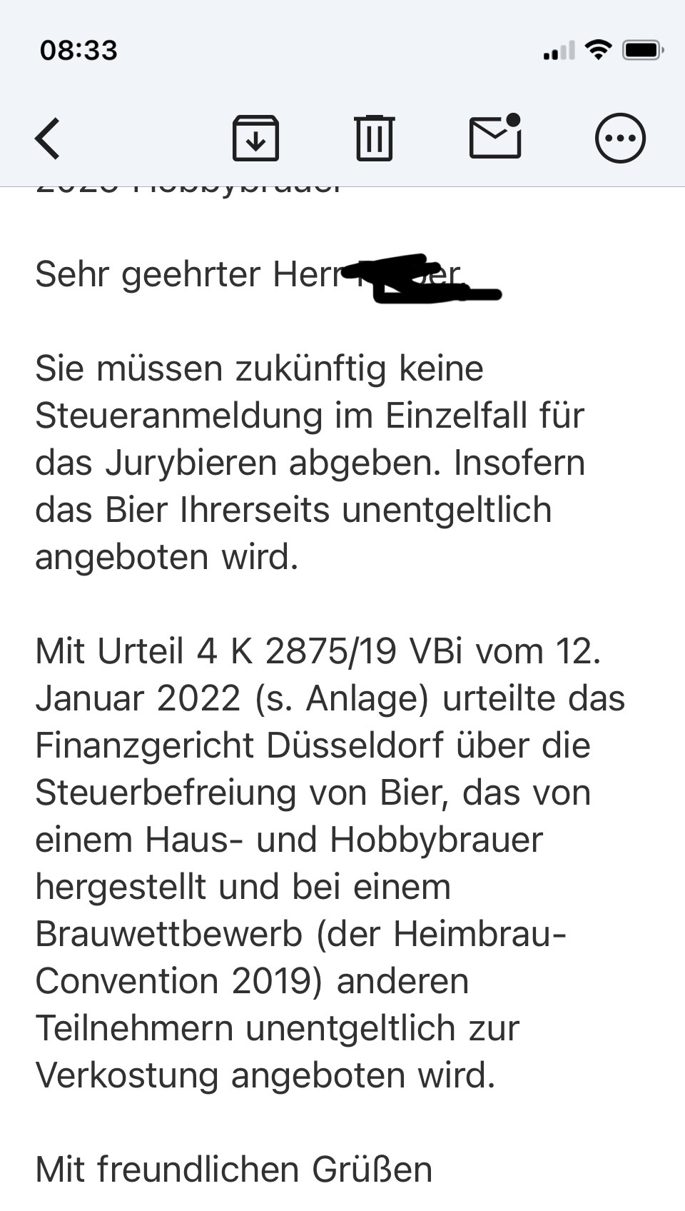Ich hatte beim HZA Lörrach angefragt, ob ich für meine Wettbewerbsbiere eine Steueranmeldung machen soll oder nicht und ob sie entsprechend dem Urteil 4 K 2875/19 VBi vom Finanzgericht Düsseldorf auch der Auffassung sind, dass es sich bei der unentgeltlichen Bereitstellung zur Verkostung durch Jury und andere Teilnehmer um eigenen Verbrauch handelt.