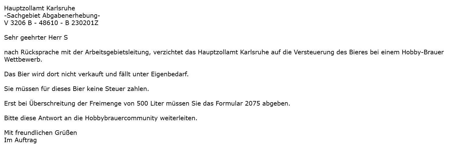(unterzeichnet von einem Herrn Köhler)...sind keine Änderungen bezüglich der steuerlichen Behandlung von Brau-Wettbewerben bekannt, so dass auch weiterhin Bier, welches durch Haus- und Hobbybrauer hergestellt und im Rahmen von Brau-Wettbewerben ausgeschenkt werden soll, nicht von Begriff "zum eigenen Verbrauch" umfasst ist und daher versteuert werden muss.