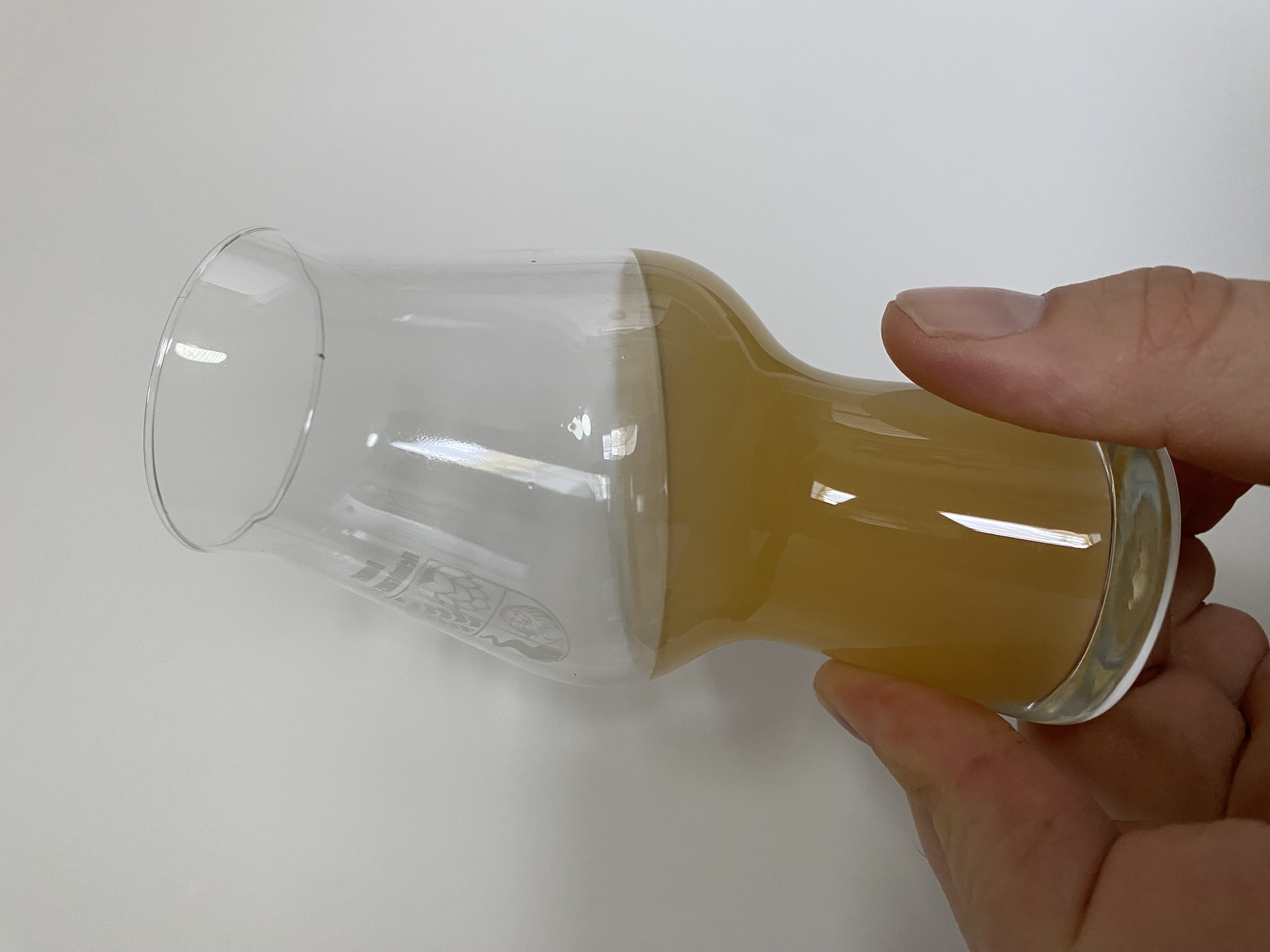 Hier ein kleines Update. Nach 6 Tagen der Hauptgärung liegt der aktuelle sRestextrakt bei etwas über 2%. Mir ist auch aufgefallen, dass ich oben gar nichts zur Stammwürze geschrieben habe. Die Stammwürze lag bei 10,2°P. Für das Original ist es etwa 4°P zu hoch, ich wollte aber nicht weiter verdünnen. auf dem Bild seht ihr wenigstens schonmal die Farbe und Trübheit. Aus dem Bericht, an dem ich mich orientiert habe, geht hervor, dass es sich auch nicht groß klären wird. Deshalb wurde es auch traditionell in Steinkrügen serviert.