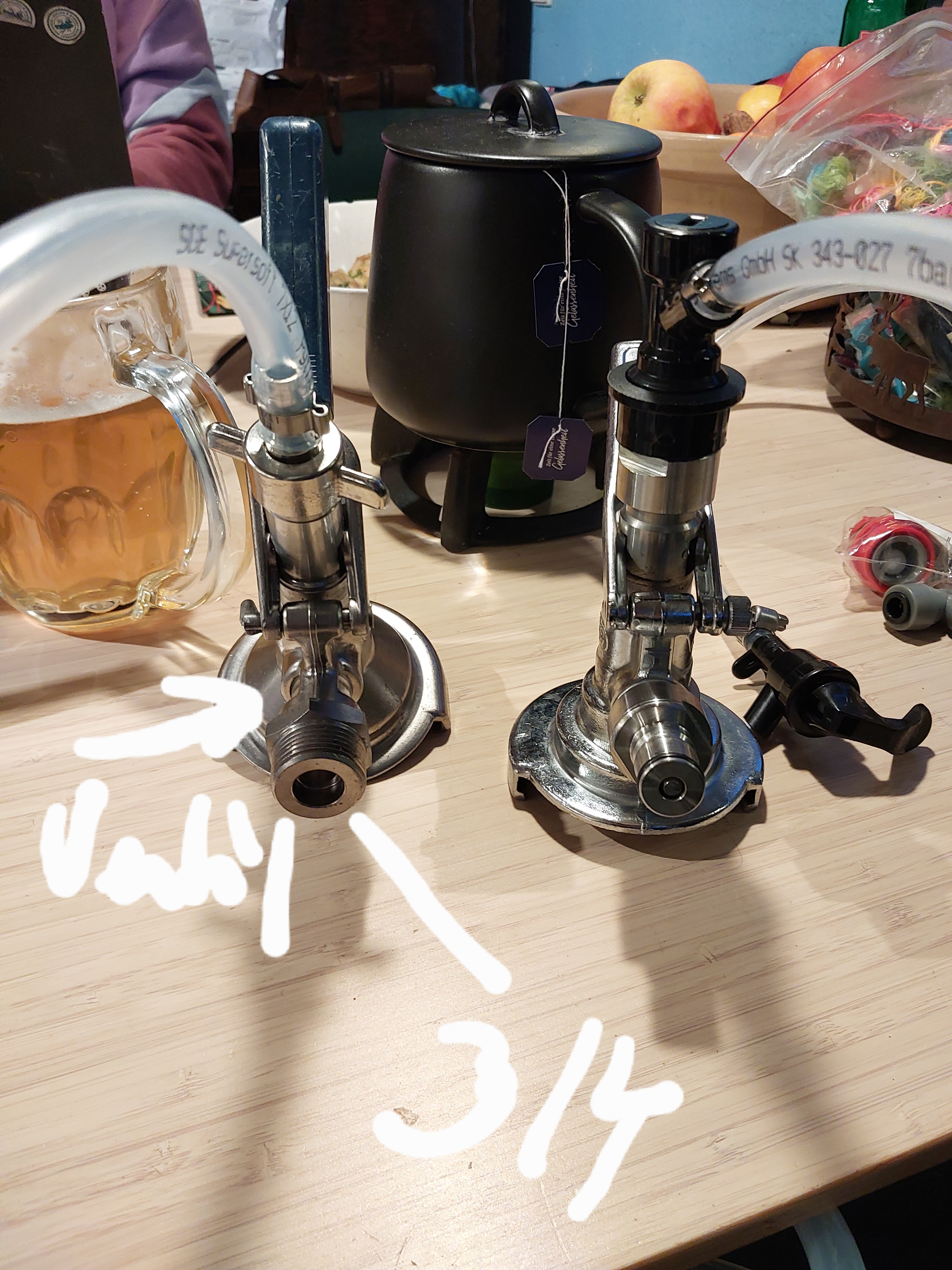 Ich habe zwei Zapfköpfe. Eins ist umgerüstet mit 5/8 Zoll Adapter und kann so einfach meine CO2 und meine Bierleitungen an beide Systeme anschließen. Siehe Bild.