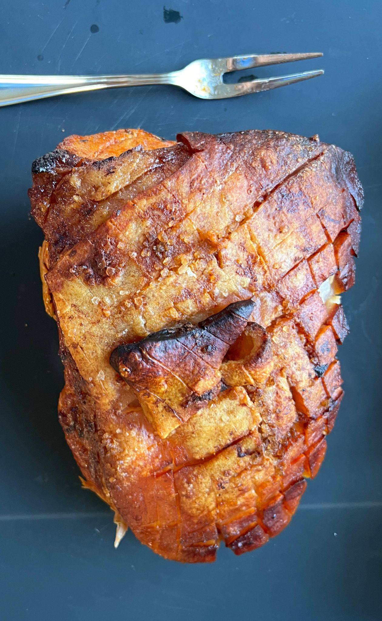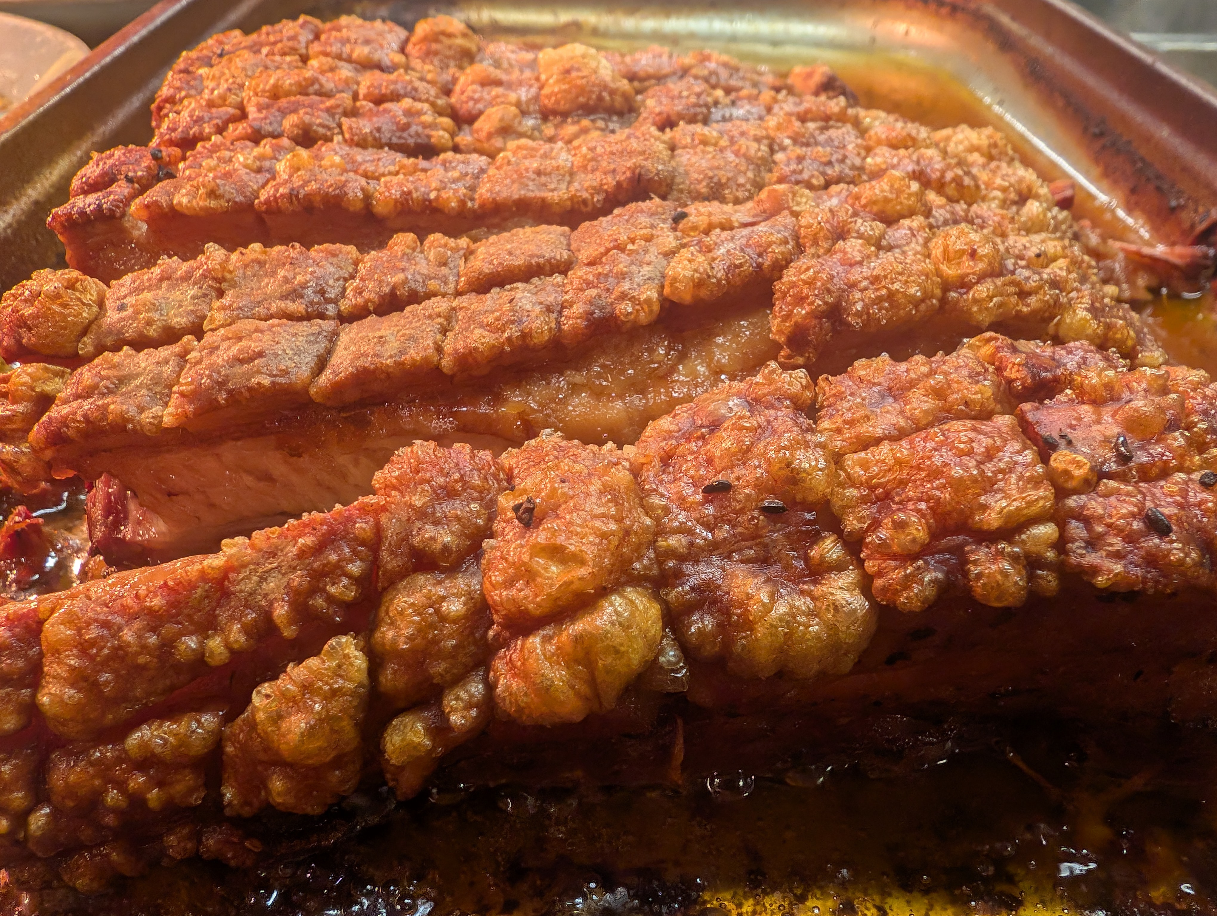 Und Vorteil im Backofen. Am Ende kann man mit der Grillfunktion von oben die Schwarte noch richtig schön aufpoppen lassen.