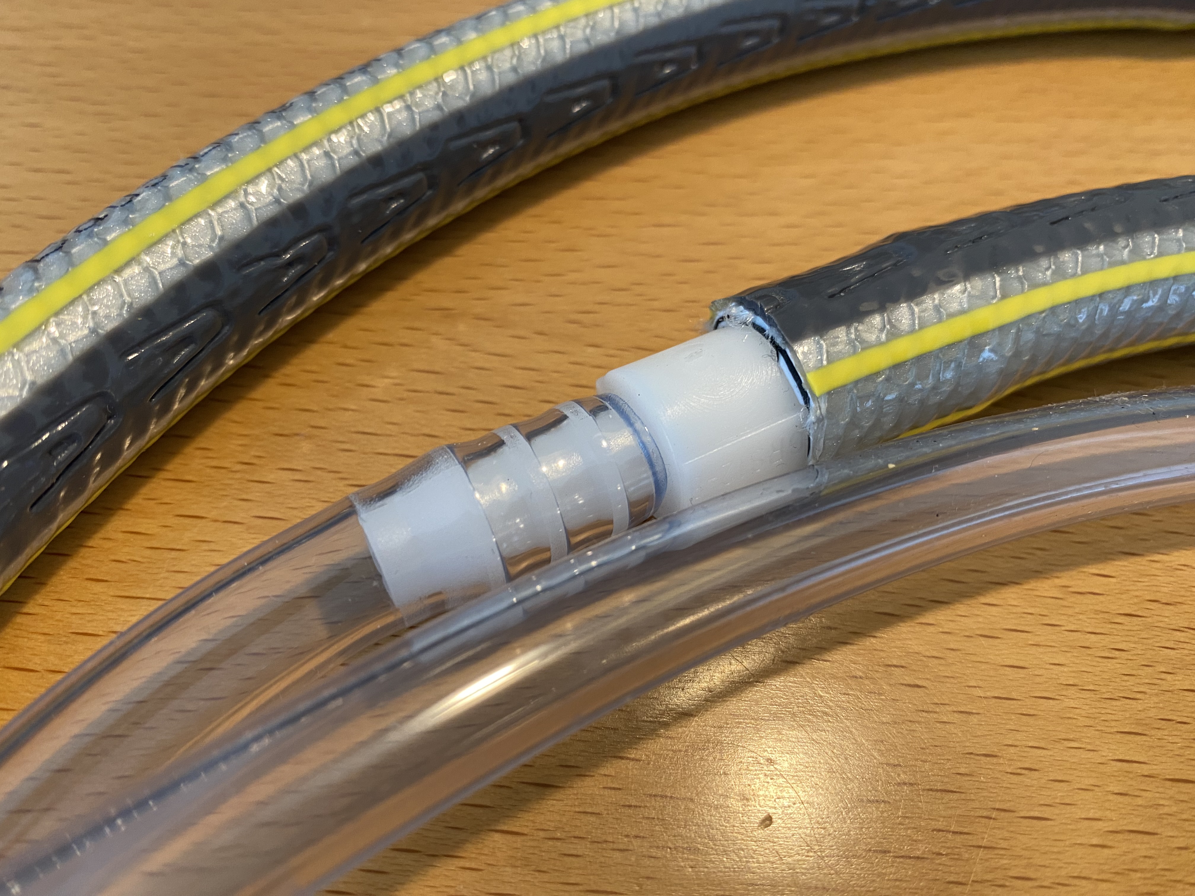 Mein Schlauchverbinder war in der Mitte sehr dick und passte nicht in den Gartenschlauch, weshalb ich ihn erst etwas rundgeschnitten haben und dann in einen Akkuschrauber gespannt mit etwas Schmiergelpapier rund gedreht habe.