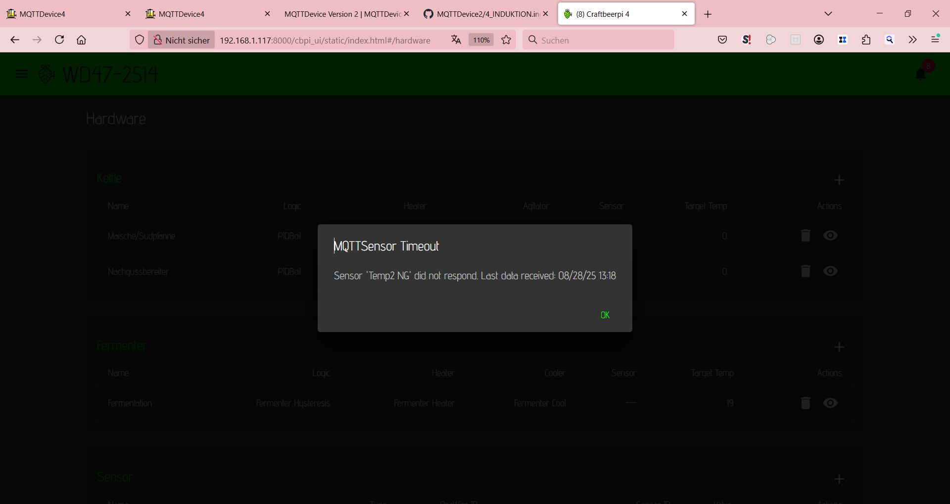 Hab es gerade noch ergänzt. - Auch wenn die Ansteuerung von Rührwerk und Nagussbereiter über die GPIO und SSR einwandfrei läuft?Innuendo hat geschrieben: Donnerstag 28. August 2025, 16:20 Hast Du den MQTT Broker korrekt eingetragen? Das MQTTDevice sendet an den MQTT Broker die Sensor Daten. CBPi4 holt sich diese Daten vom Broker. Deinen Bildern nach zu urteilen, findet keine Kommunikation statt.