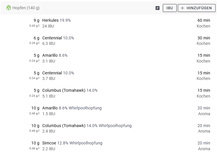 - Ich habe mehrere Rezepte importiert, da hat er den allgemeinen Step Würzekochen nicht mit eingefügt und dadurch sind auch die ganzen Zeiten für die Hopfengaben nicht mehr stimmig. Ich habe das Gefühl das passiert wenn die erste Hopengabe direkt zu Kochbeginn ist und somit die gleiche Dauer wie die Gesamtkochzeit hat. Ob die 0°C bei einigen Kochgaben so gewollt sind kann ich aus mangelnder Erfahrung nicht sagen (war aber nicht bei allen Rezepten so).