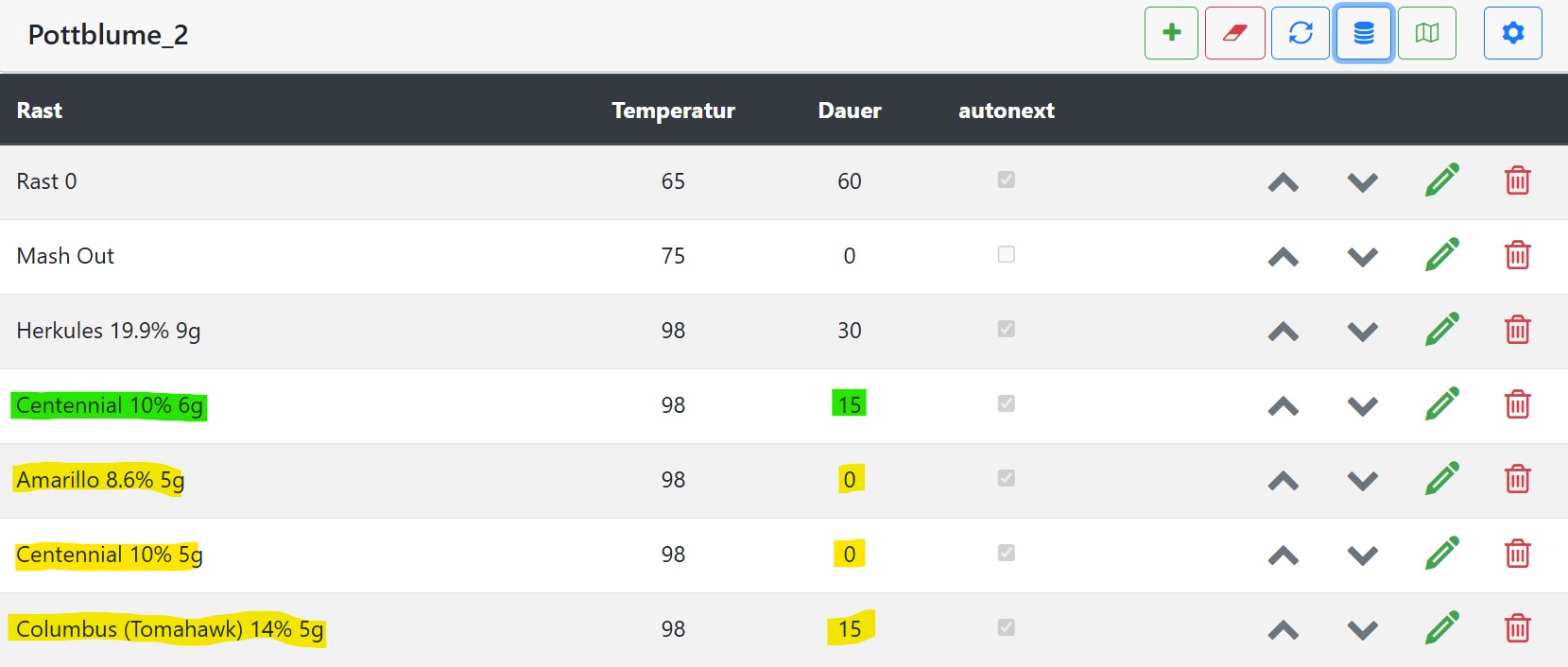 In (1) werden drei Hopfen zu gleichen Zeit gegeben (gelb markiert). Der Brautomat gibt einem Hopfen (Columbus) die Kochzeit von 15min und setzt bei den zwei anderen Hopfen die Dauer auf 0 Minuten. Das Resultat im Maischeplan ist: