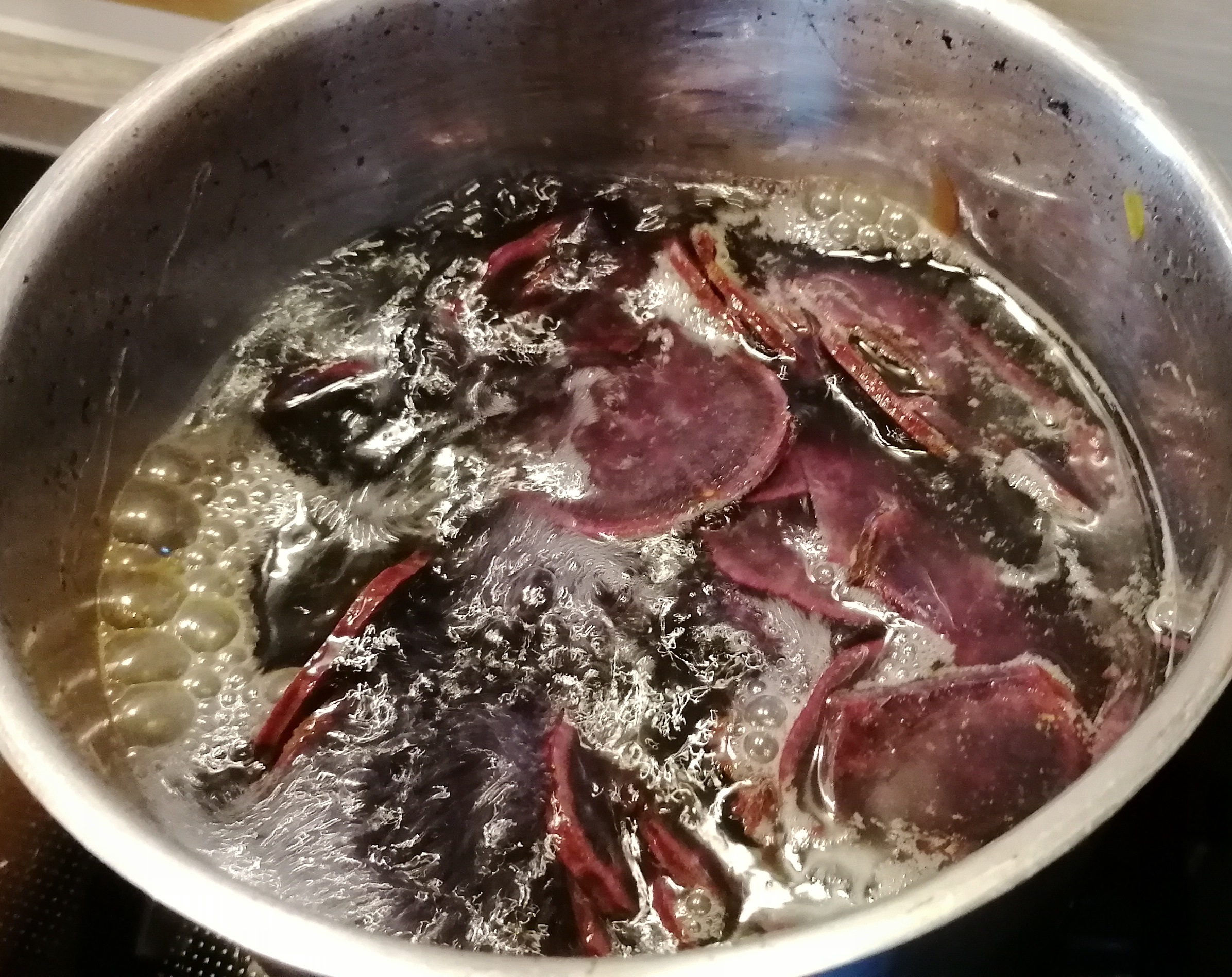 Beim letzten Sud war mir ja aufgefallen, dass der gekochte Topinambur beim gemeinsamen Kochen etwas Farbe angenommen hatte.