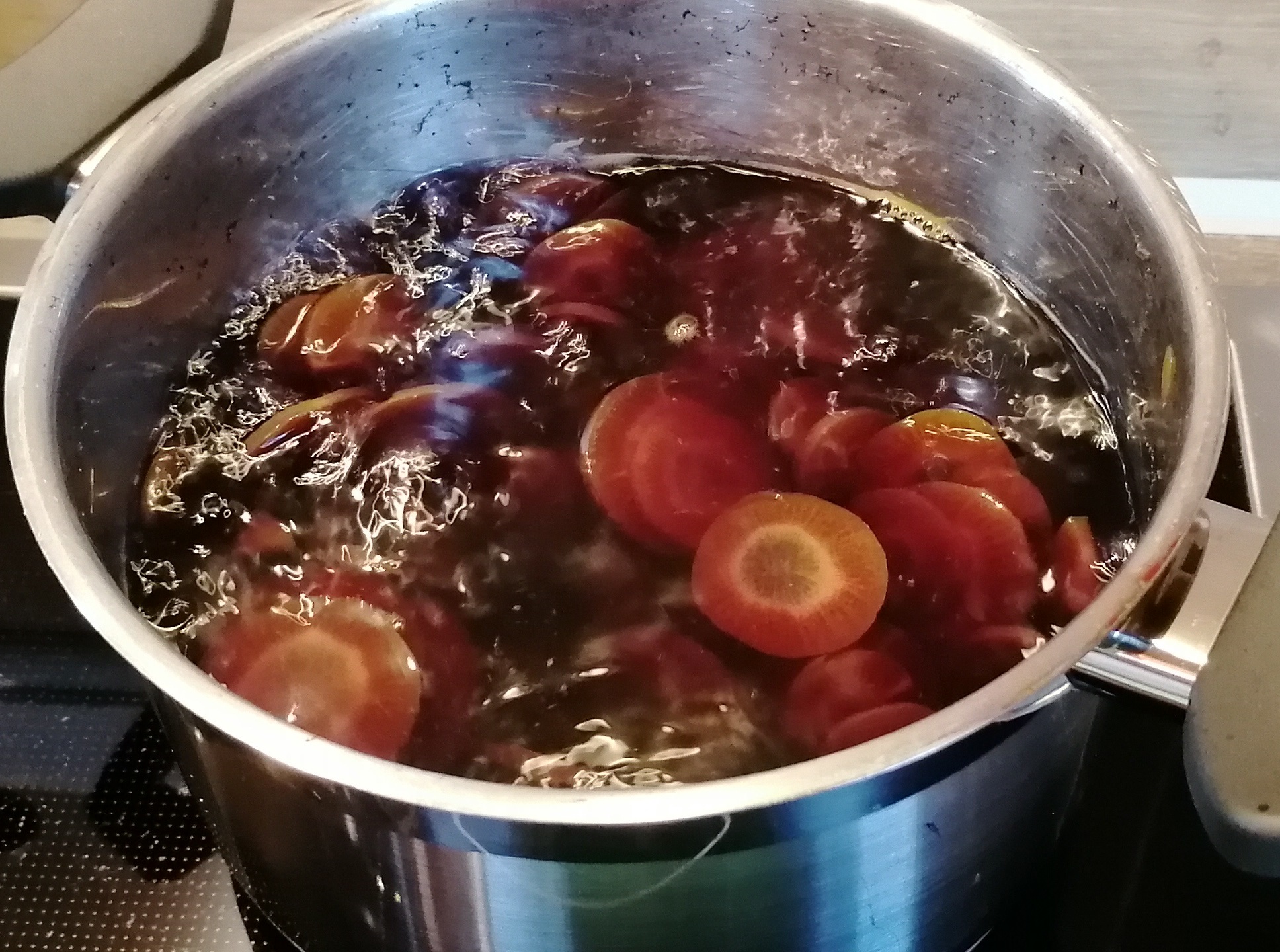 Vor kurzem hatte ich kleingeschnittene lila Karotten übrig, die ich in Froster packte. Als ich diese dann verwendete,