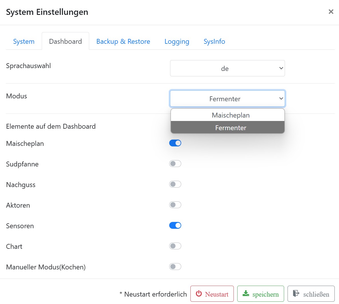 Der Modus Fermentation wird über System -> Dashboard aktiviert
