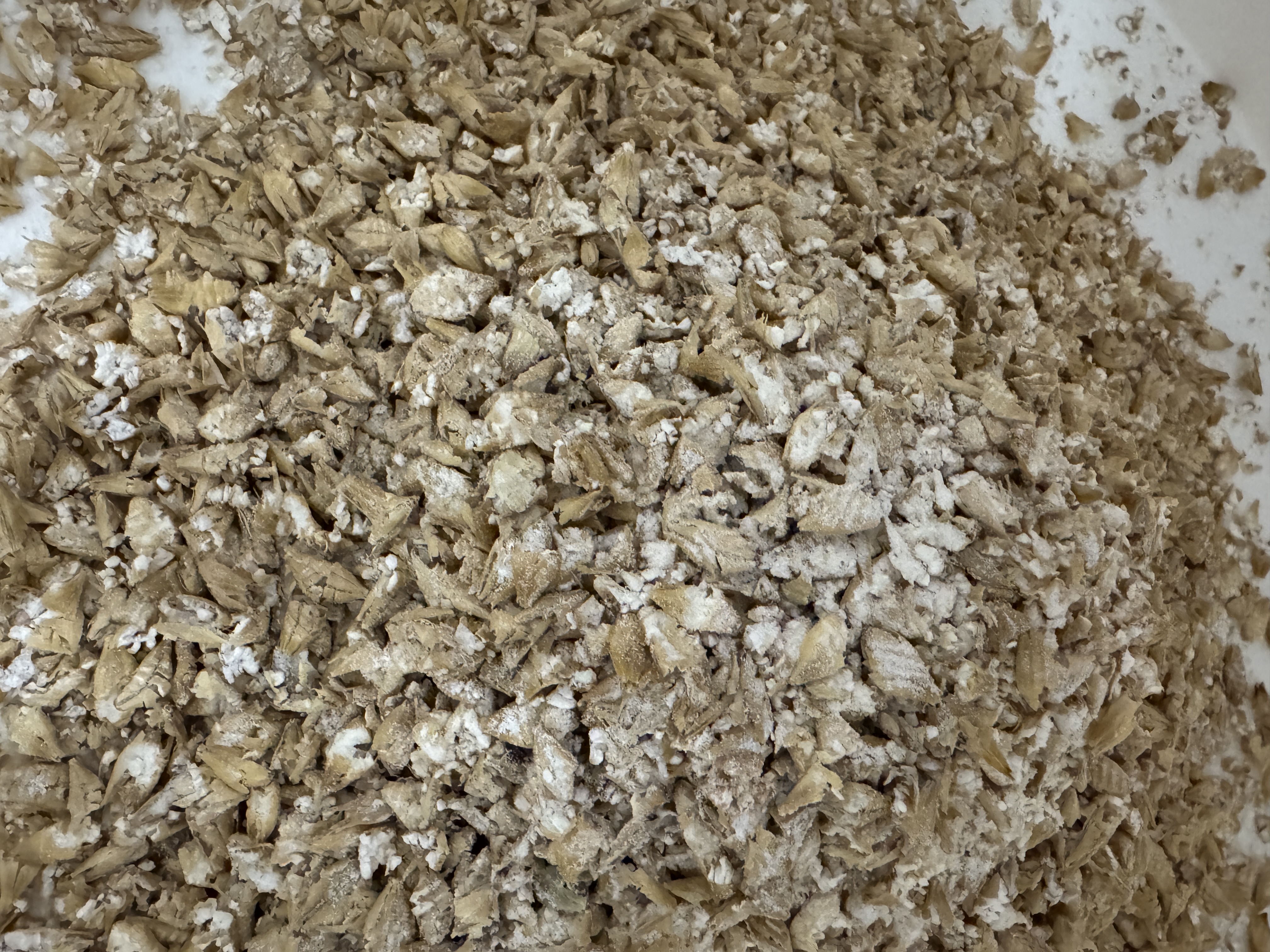 Das konditionierte 1,2mm Schrot sieht schon ganz anders aus. Direkt nach dem Schroten etwas seltsam, da viele Körner Abdrücke von der Walze zeigen und den Mehlkörper noch enthalten. Nach dem Durchmischen zeigt sich meiner Meinung nach aber ein sehr schönes Bild mit intakten Spelzen und zermahlenen Mehlkörnern.